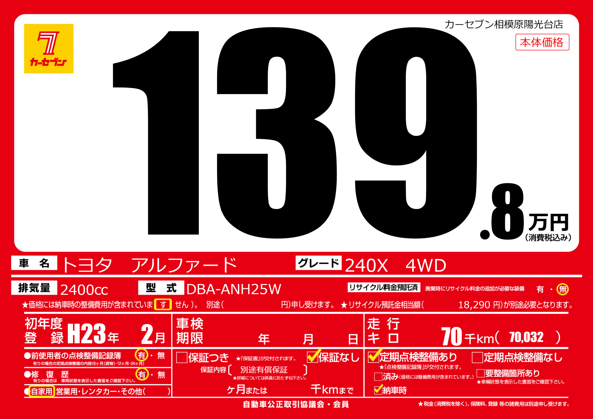 | 走行キロ | 7万km | 初年度登録 | H23年2月 |