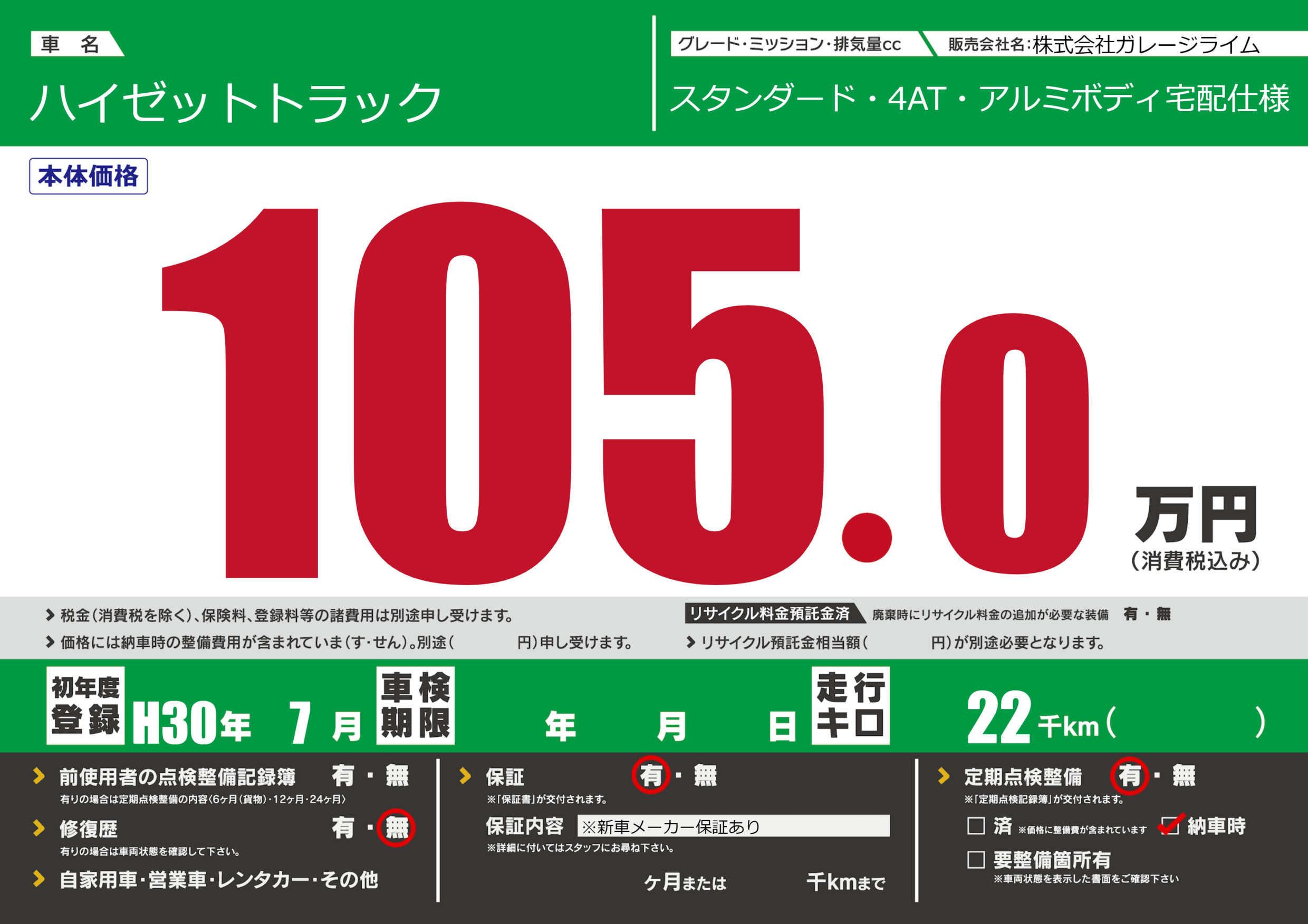 | 定期点検整備 | 定期点検整備あり 納車時あり | ||