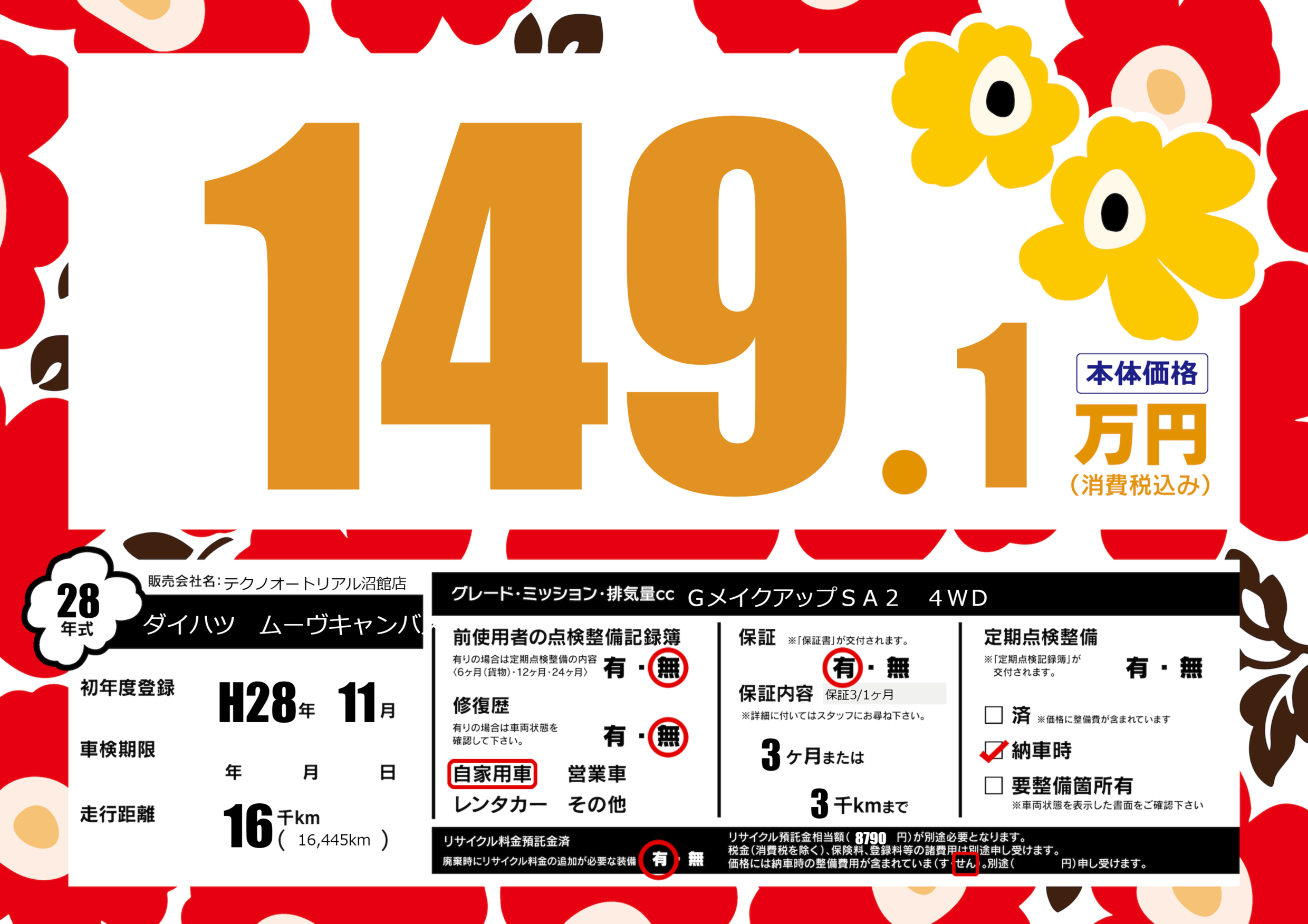 | 走行キロ | 1.6万km | 初年度登録 | H28年11月 |