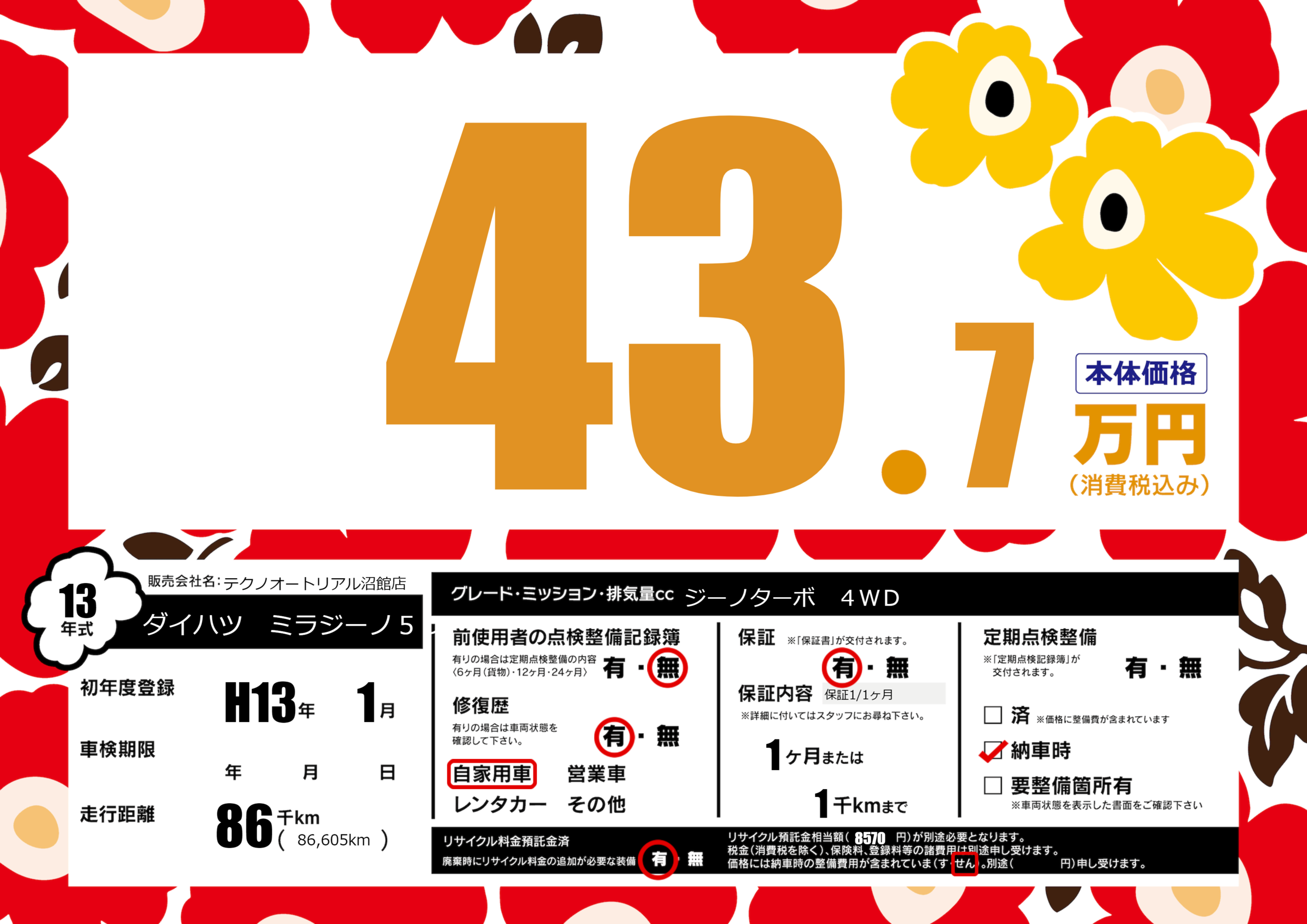 | 走行キロ | 8.6万km | 初年度登録 | H13年1月 |