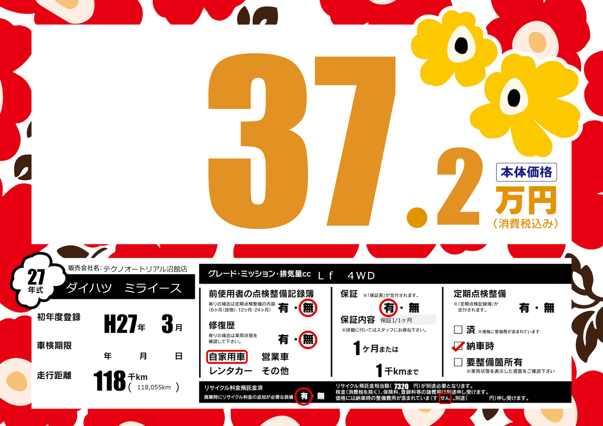 | 走行キロ | 11.8万km | 初年度登録 | H27年3月 |
