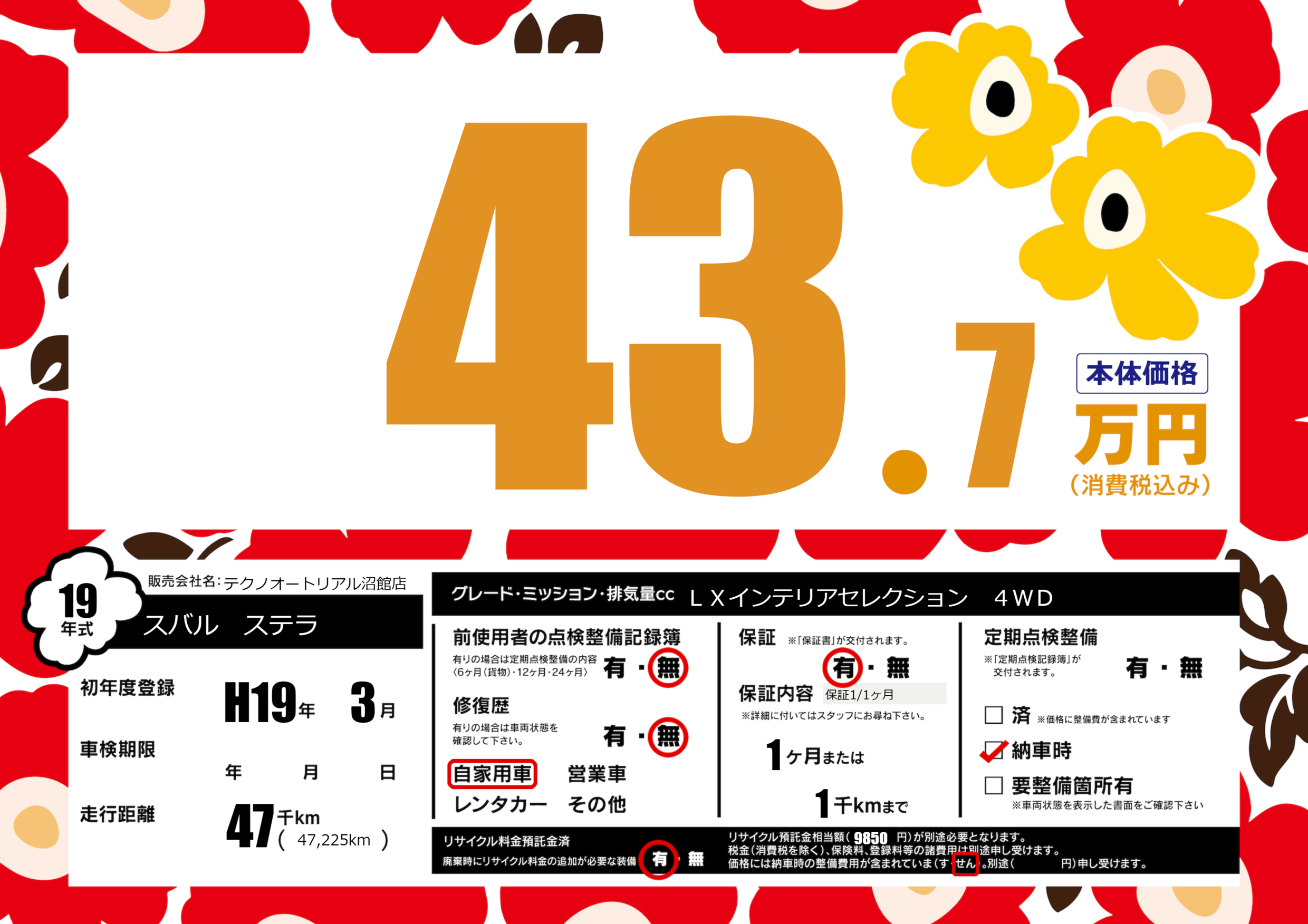| 車名 | スバル ステラ | グレード ミッション 排気量 |