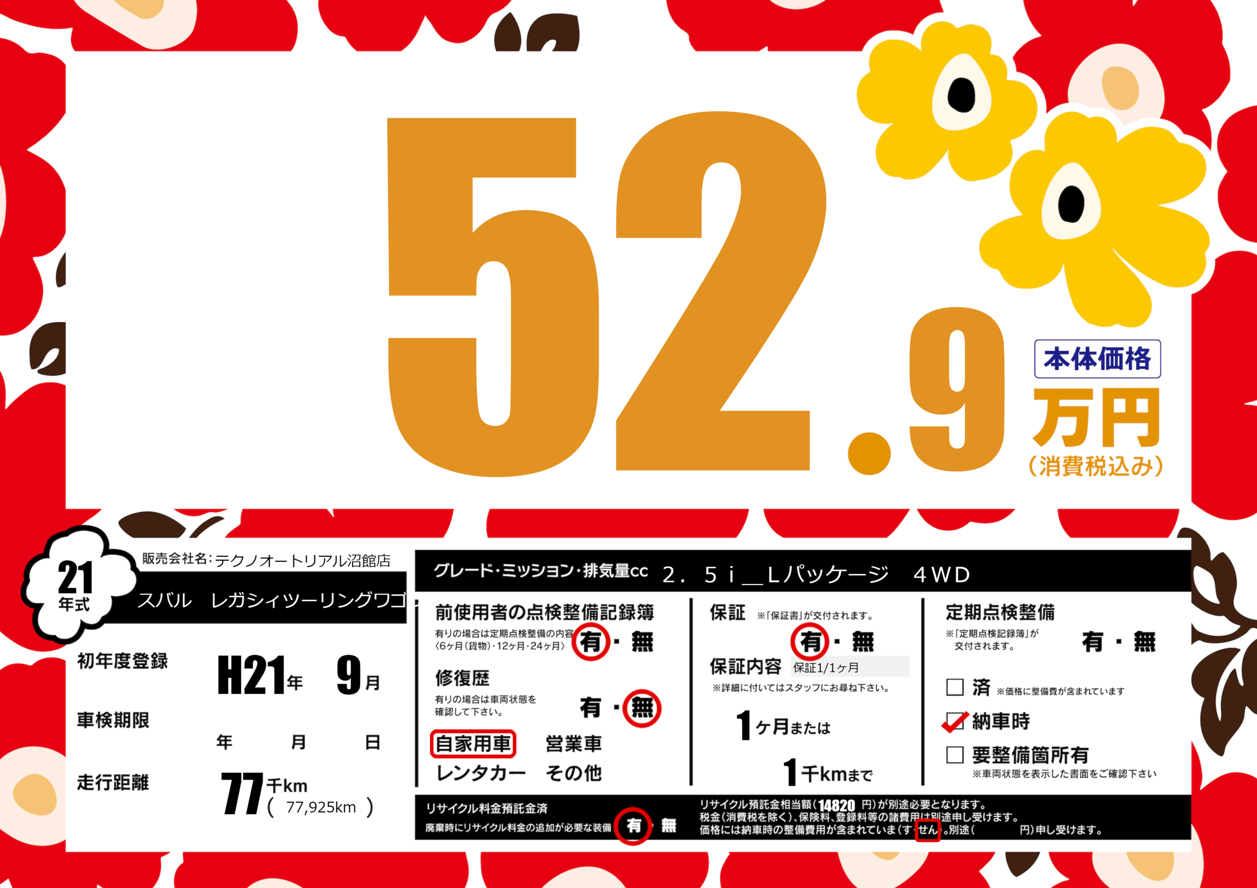 | 走行キロ | 7.7万km | 初年度登録 | H21年9月 |