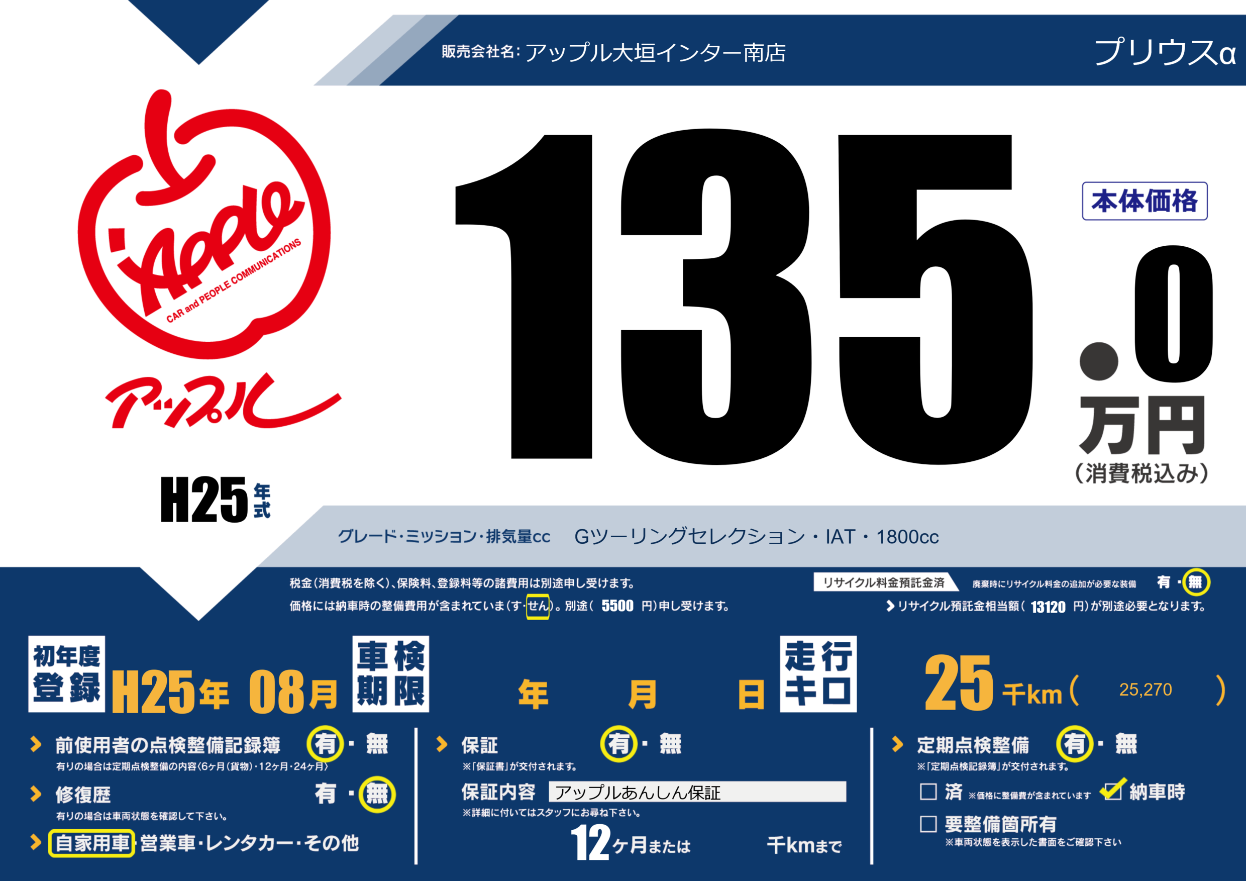 | 車名 | プリウスα | グレード ミッション 排気量 |