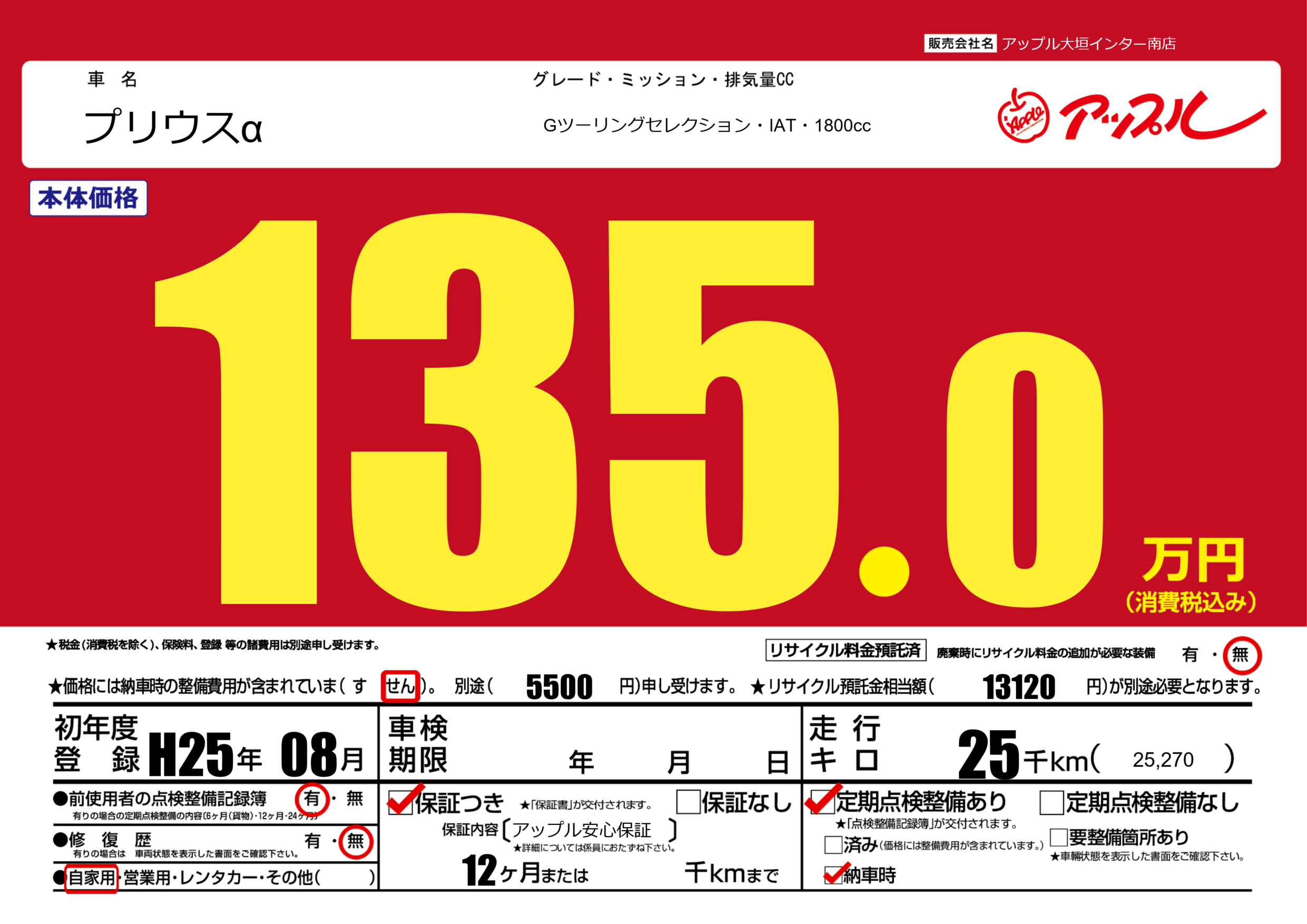 | 車名 | プリウスα | グレード ミッション 排気量 |