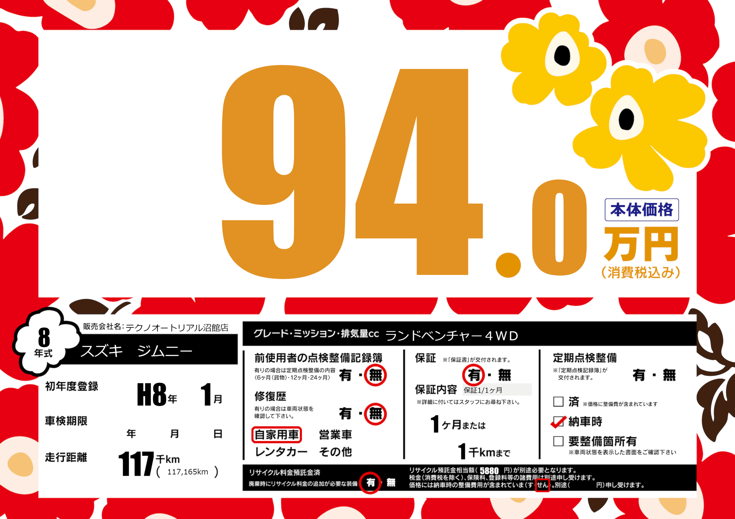 | 走行キロ | 11.7万km | 初年度登録 | H8年1月 |