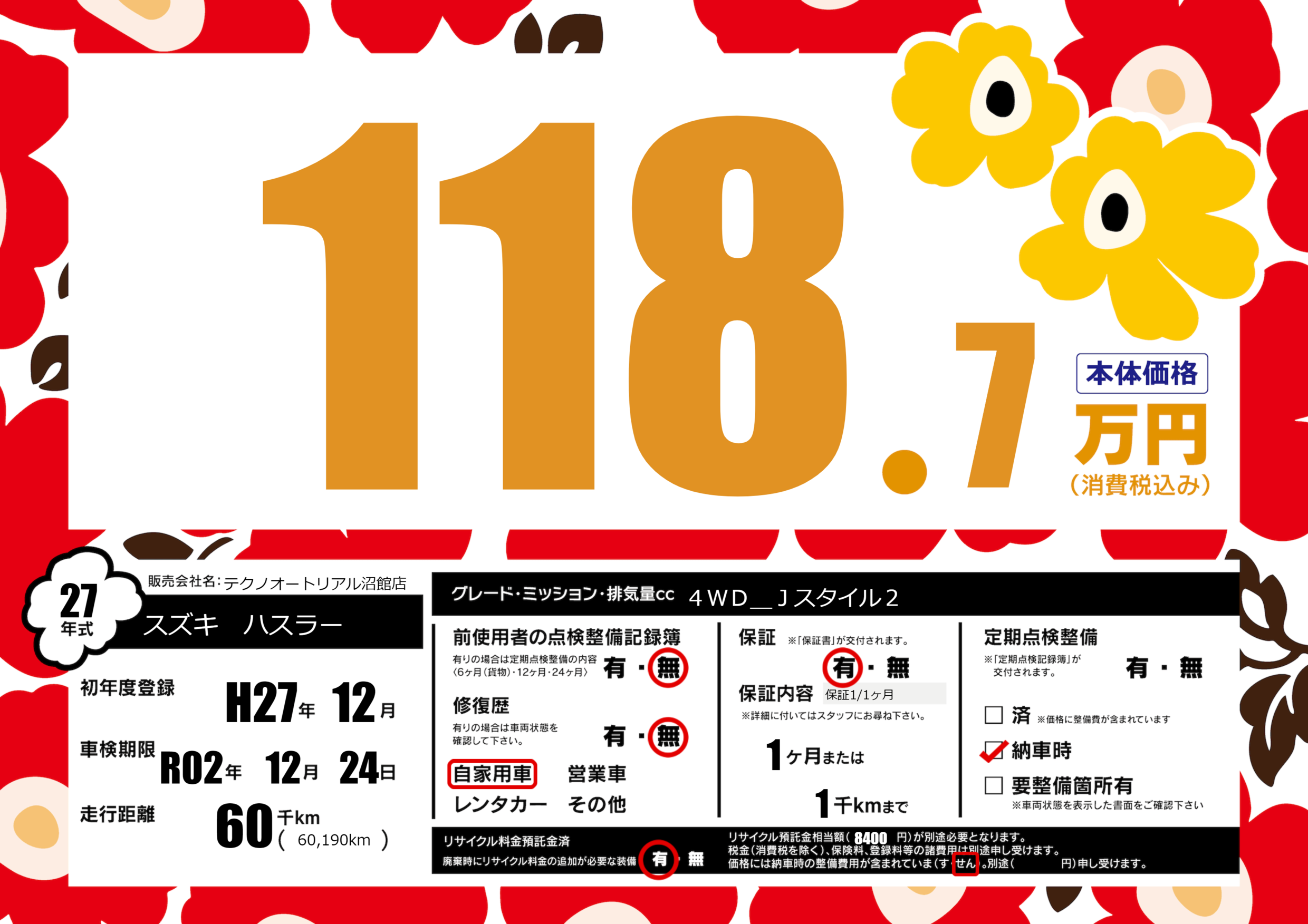 | 車名 | スズキ ハスラー | グレード ミッション 排気量 |
