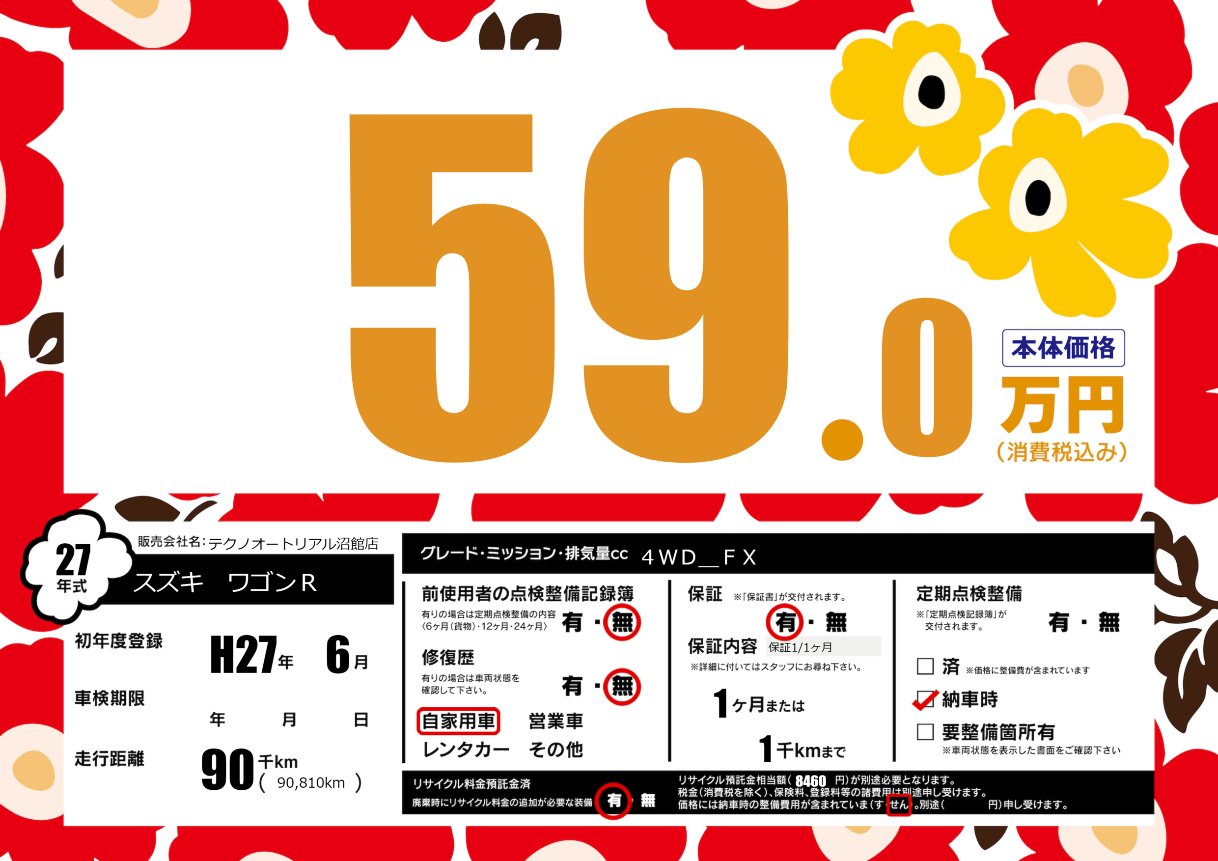 | 走行キロ | 9万km | 初年度登録 | H27年6月 |