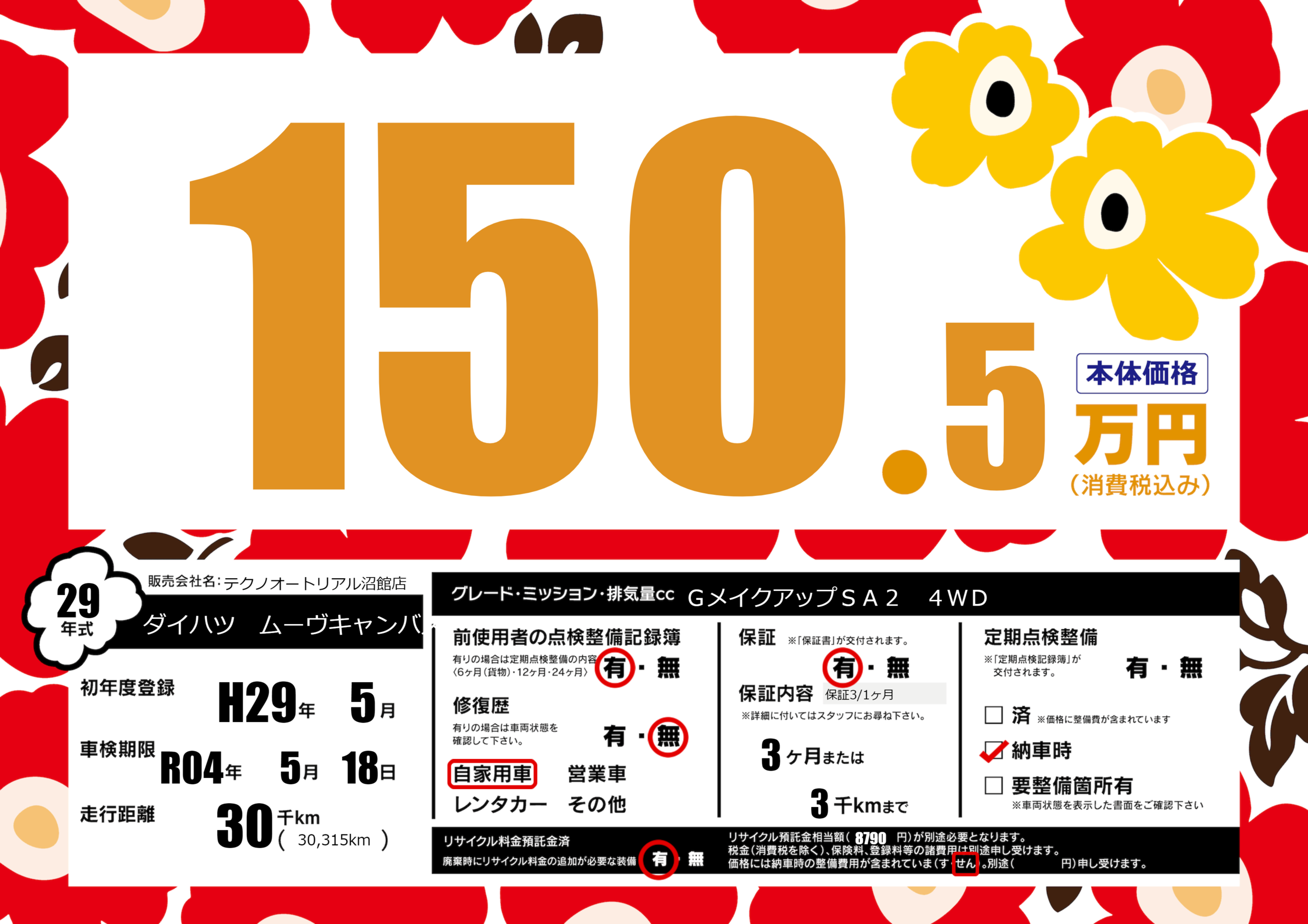 | 走行キロ | 3万km | 初年度登録 | H29年5月 |