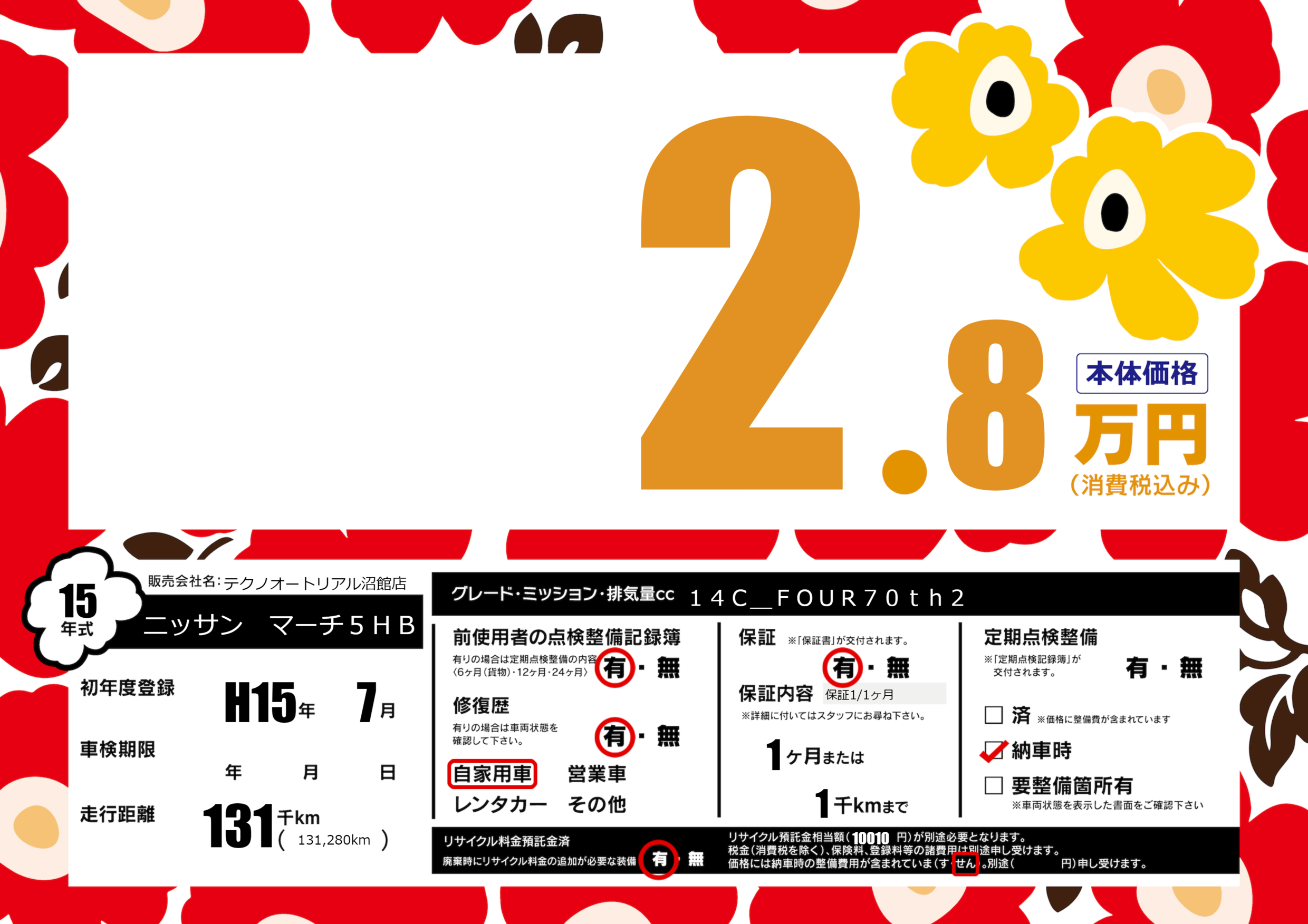 | 車名 | ニッサン マーチ5HB | グレード ミッション 排気量 |
