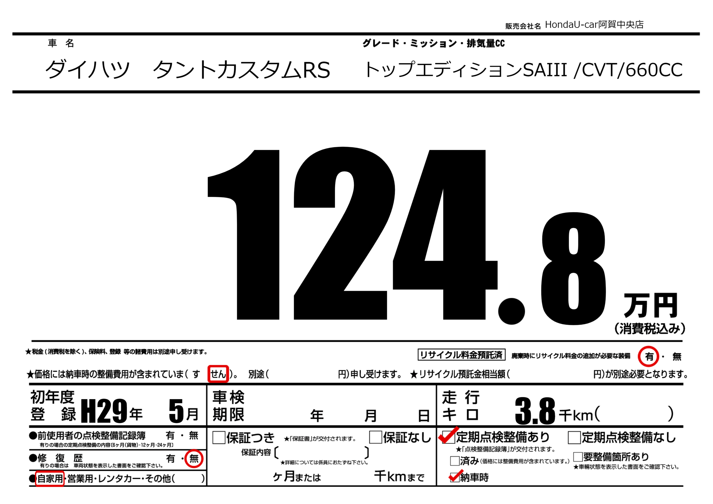 | 車名 | ダイハツ タントカスタムRS | グレード ミッション 排気量 |