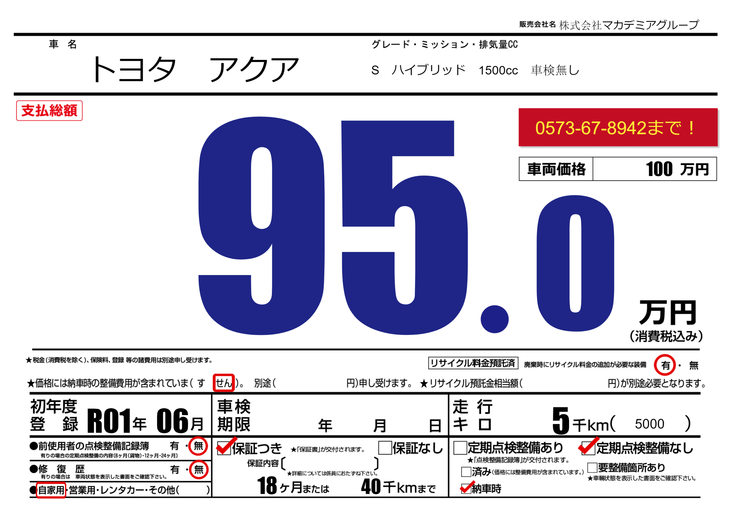 | 車名 | トヨタ アクア | グレード ミッション 排気量 |