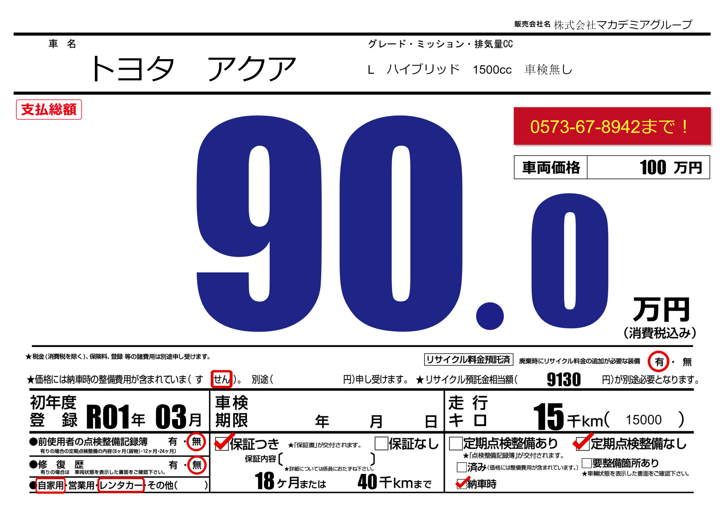 | 車名 | トヨタ アクア | グレード ミッション 排気量 |