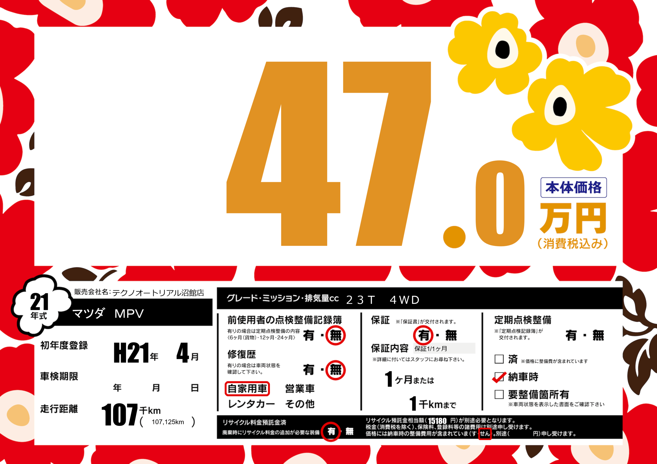 | 車名 | マツダ MPV | グレード ミッション 排気量 |