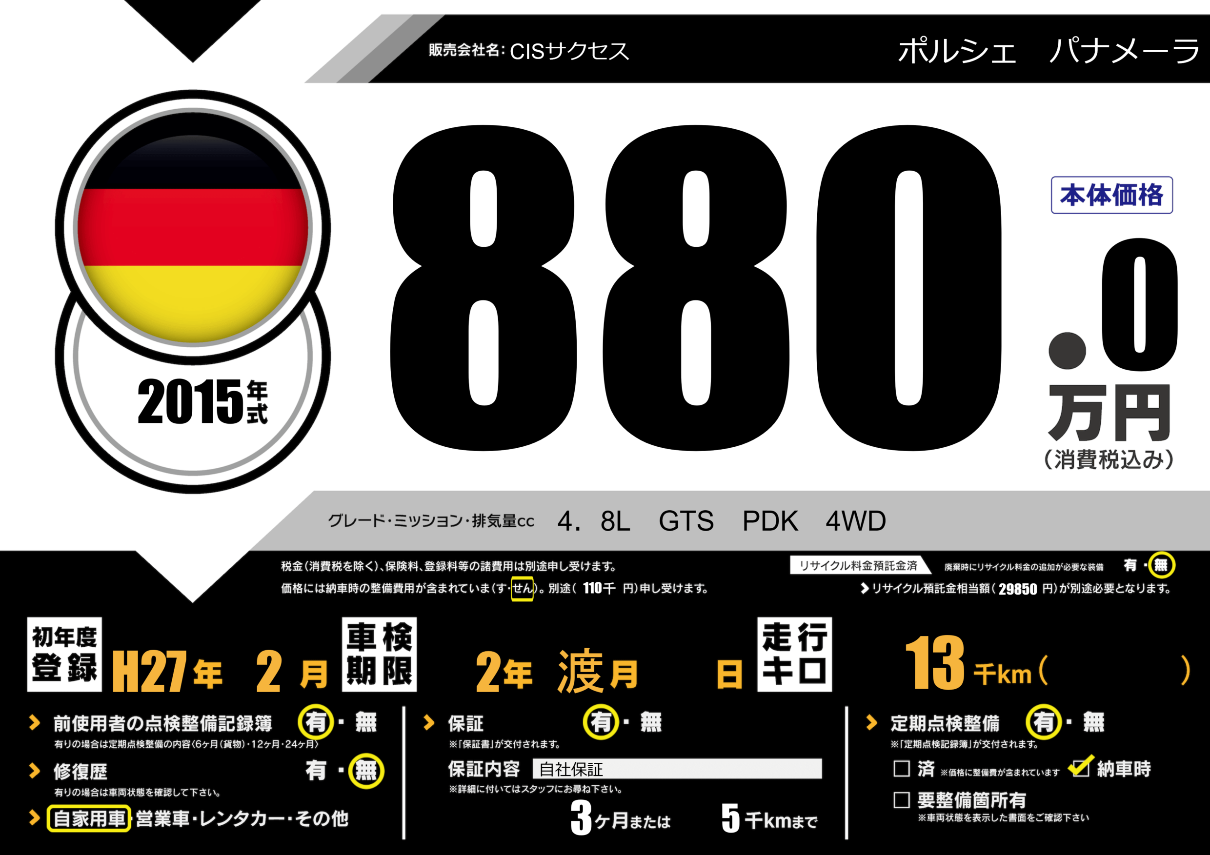 | 車名 | ポルシェ パナメーラ | グレード ミッション 排気量 |