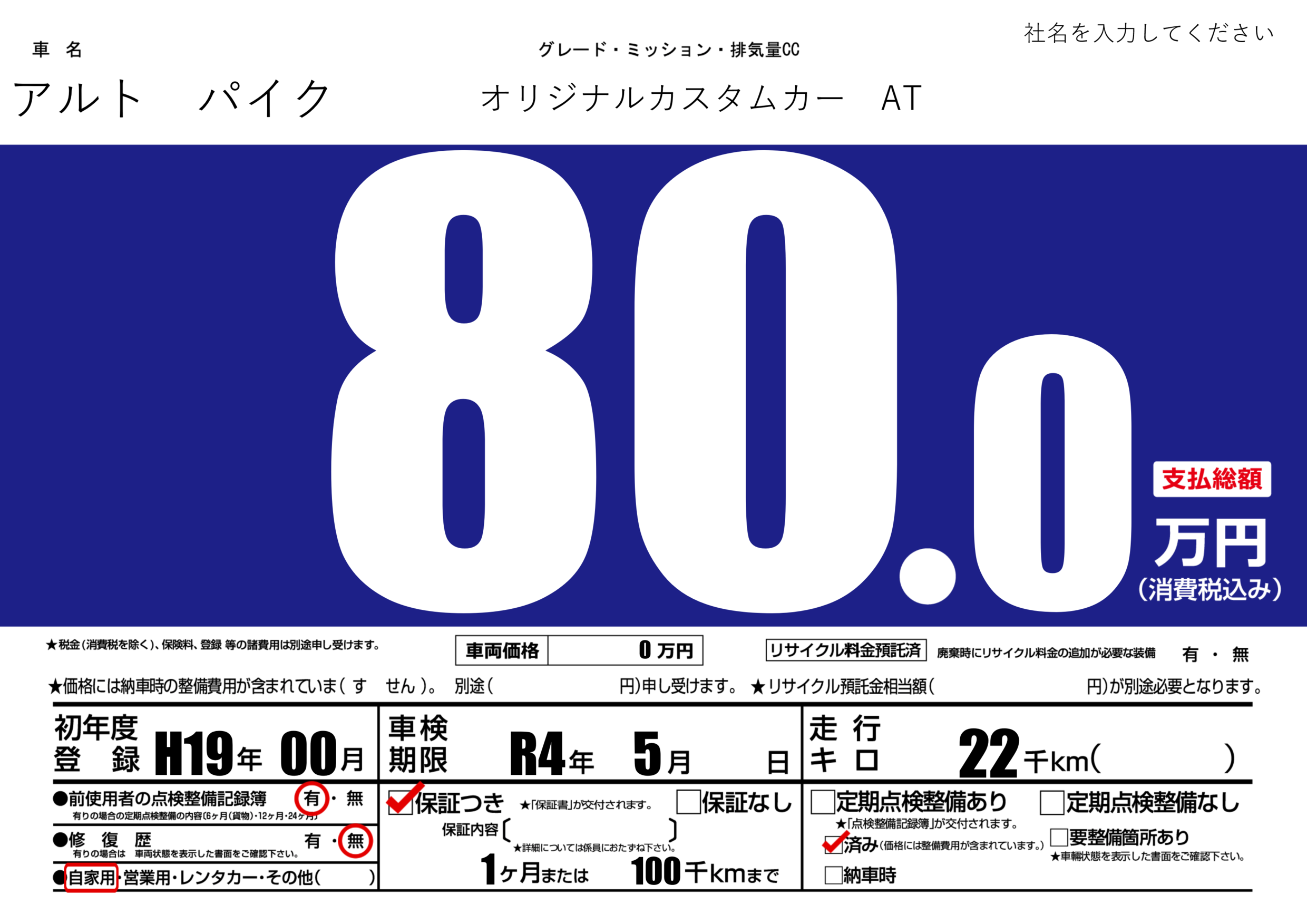 保証付き 保証内容(---) 1ヶ月または(100)千kmまで |