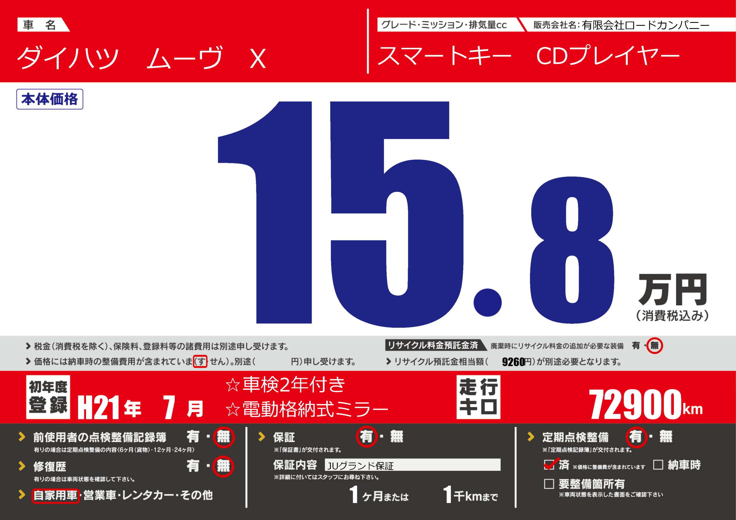 | 定期点検整備 | 定期点検整備あり 定期点検整備済み | ||