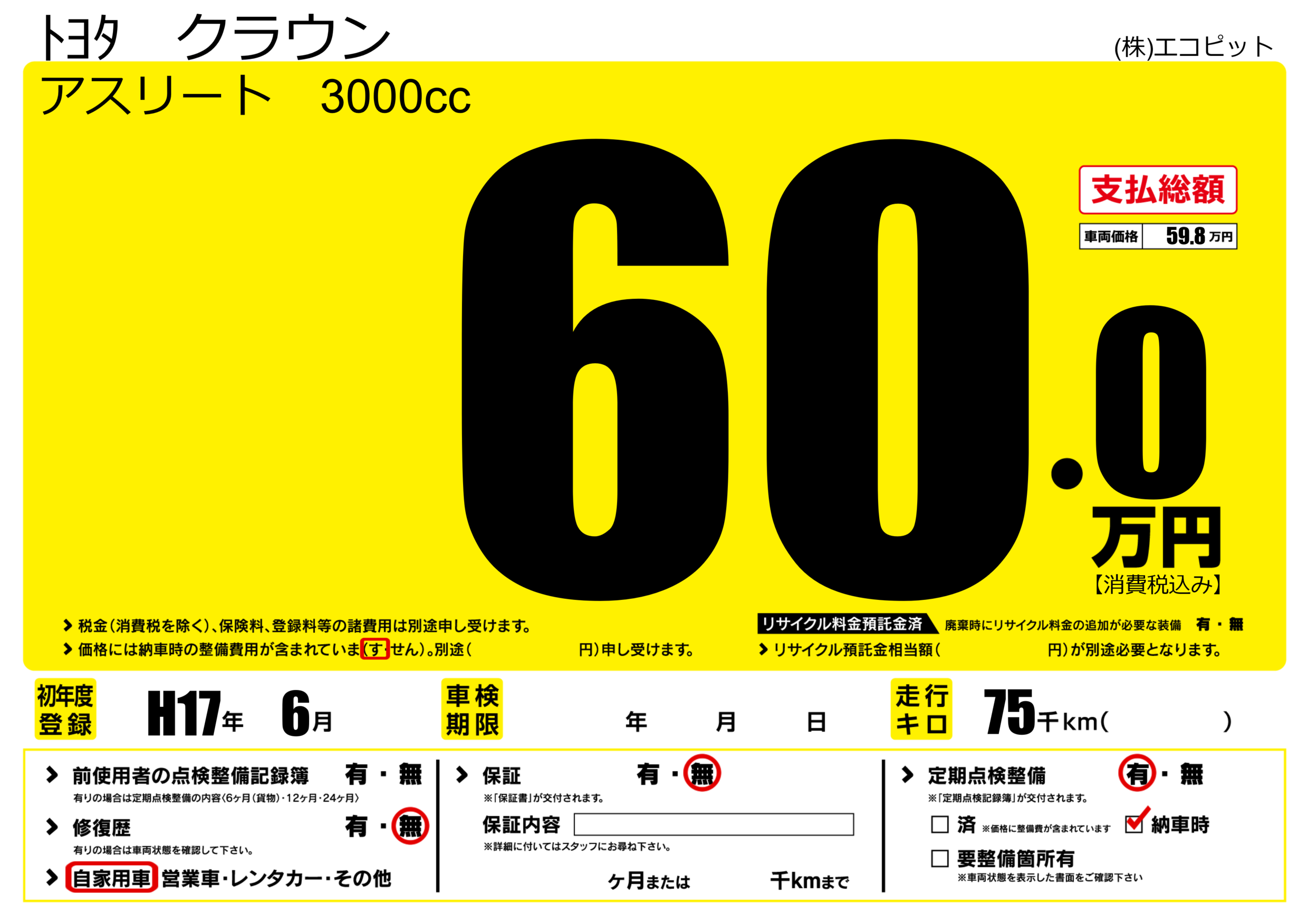 | 走行キロ | 7.5万km | 初年度登録 | H17年6月 |
