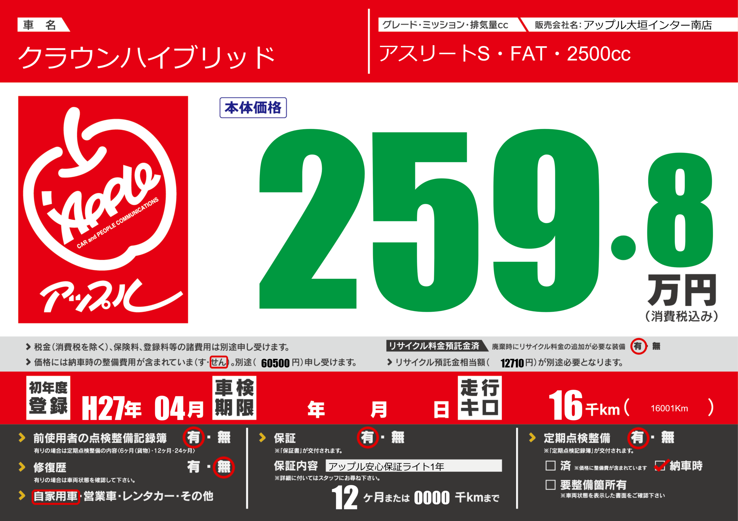 | 車名 | クラウンハイブリッド | グレード ミッション 排気量 |