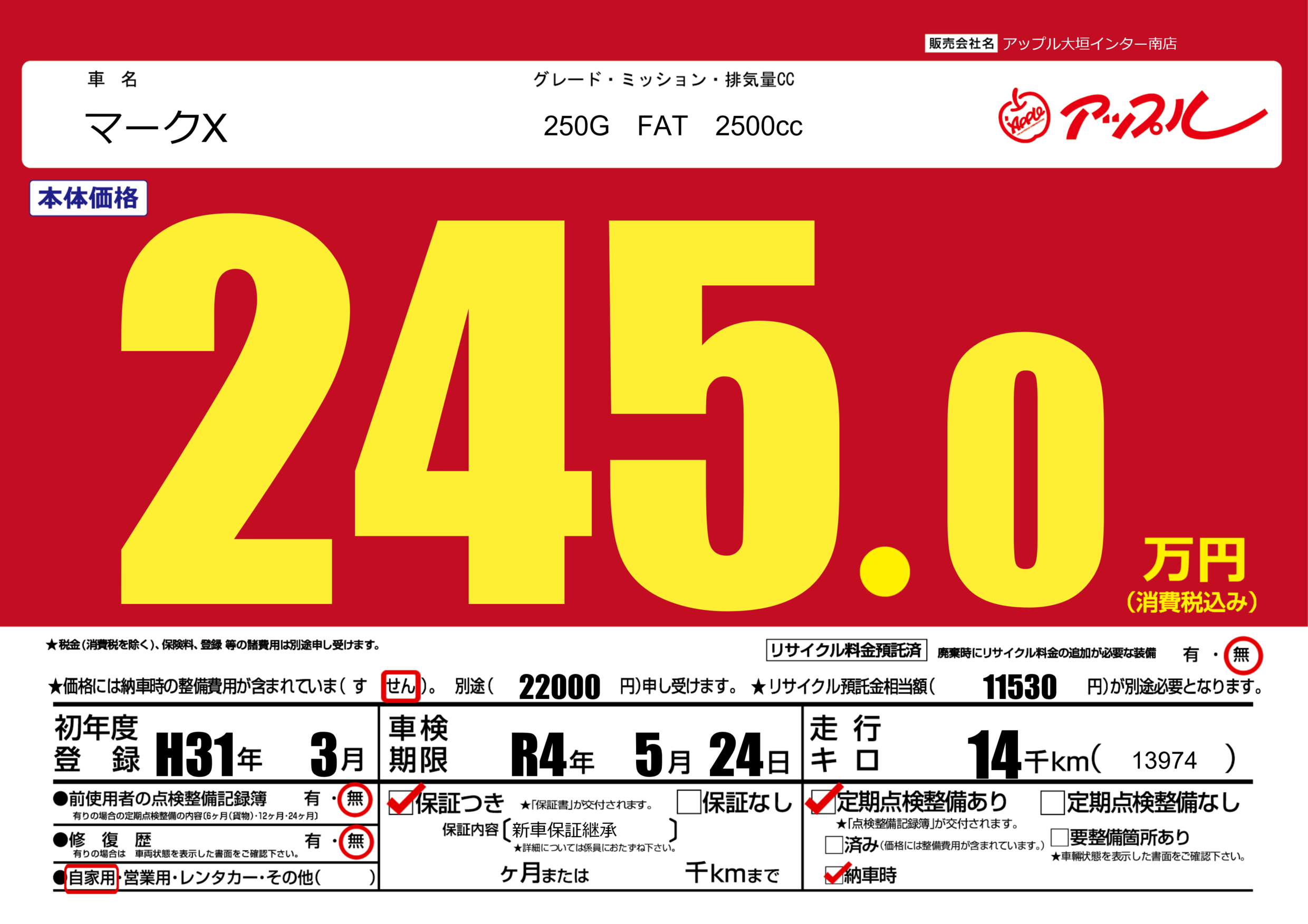 保証付き 保証内容(新車保証継承) ヶ月または千km |