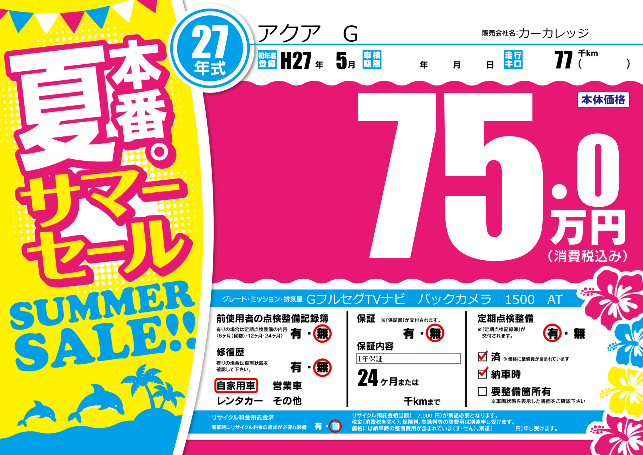 | 走行キロ | 7.7万km | 初年度登録 | H27年5月 |