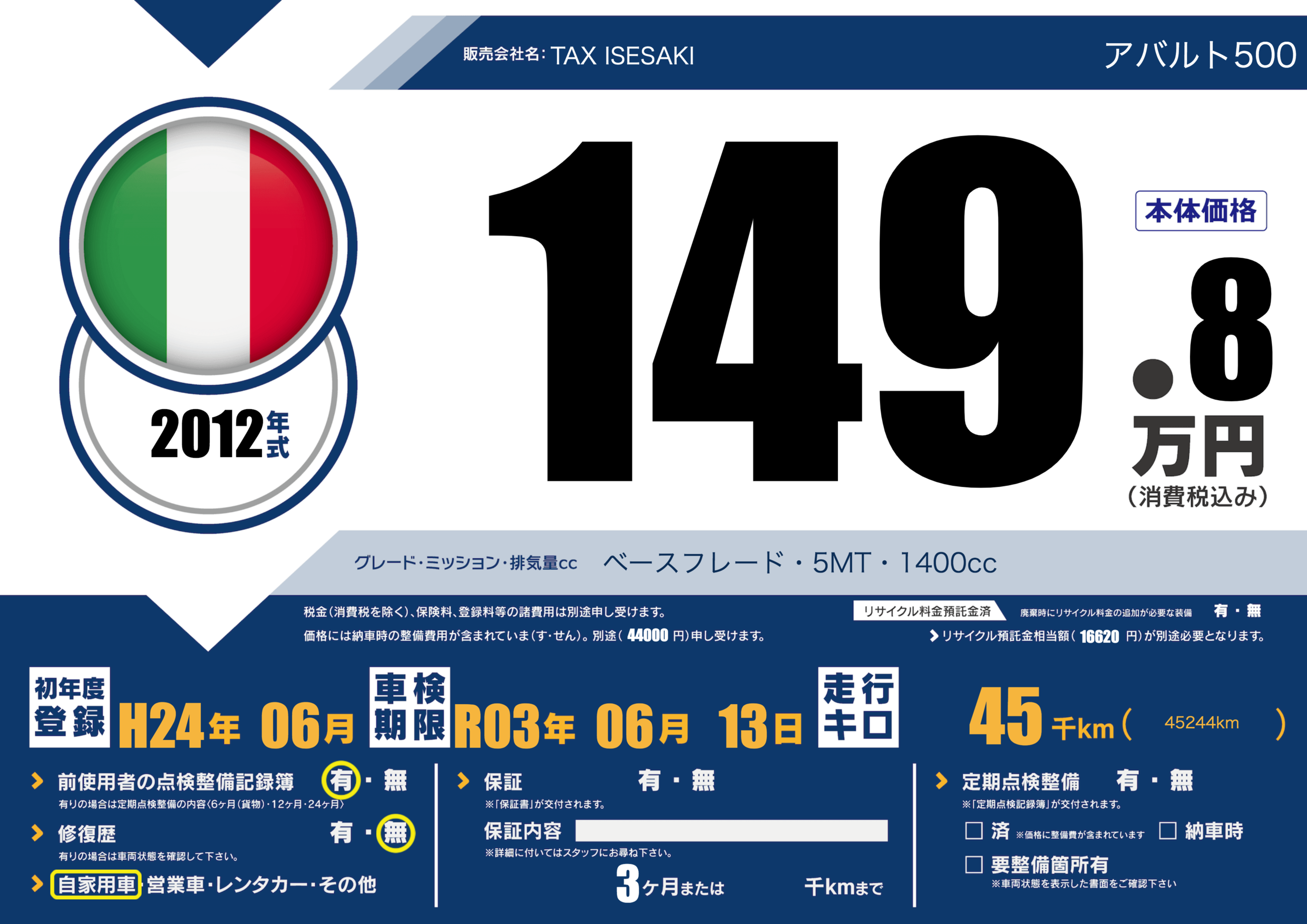 | 車名 | アバルト500 | グレード ミッション 排気量 |