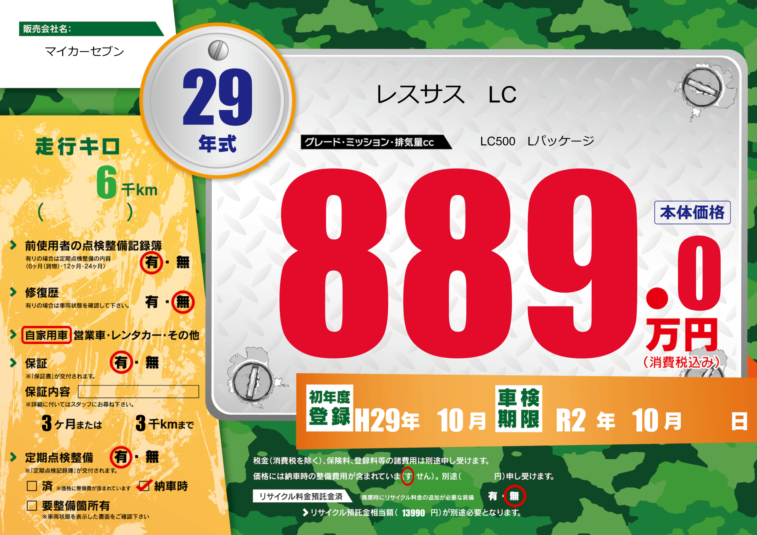 | 車名 | レスサス LC | グレード ミッション 排気量 |