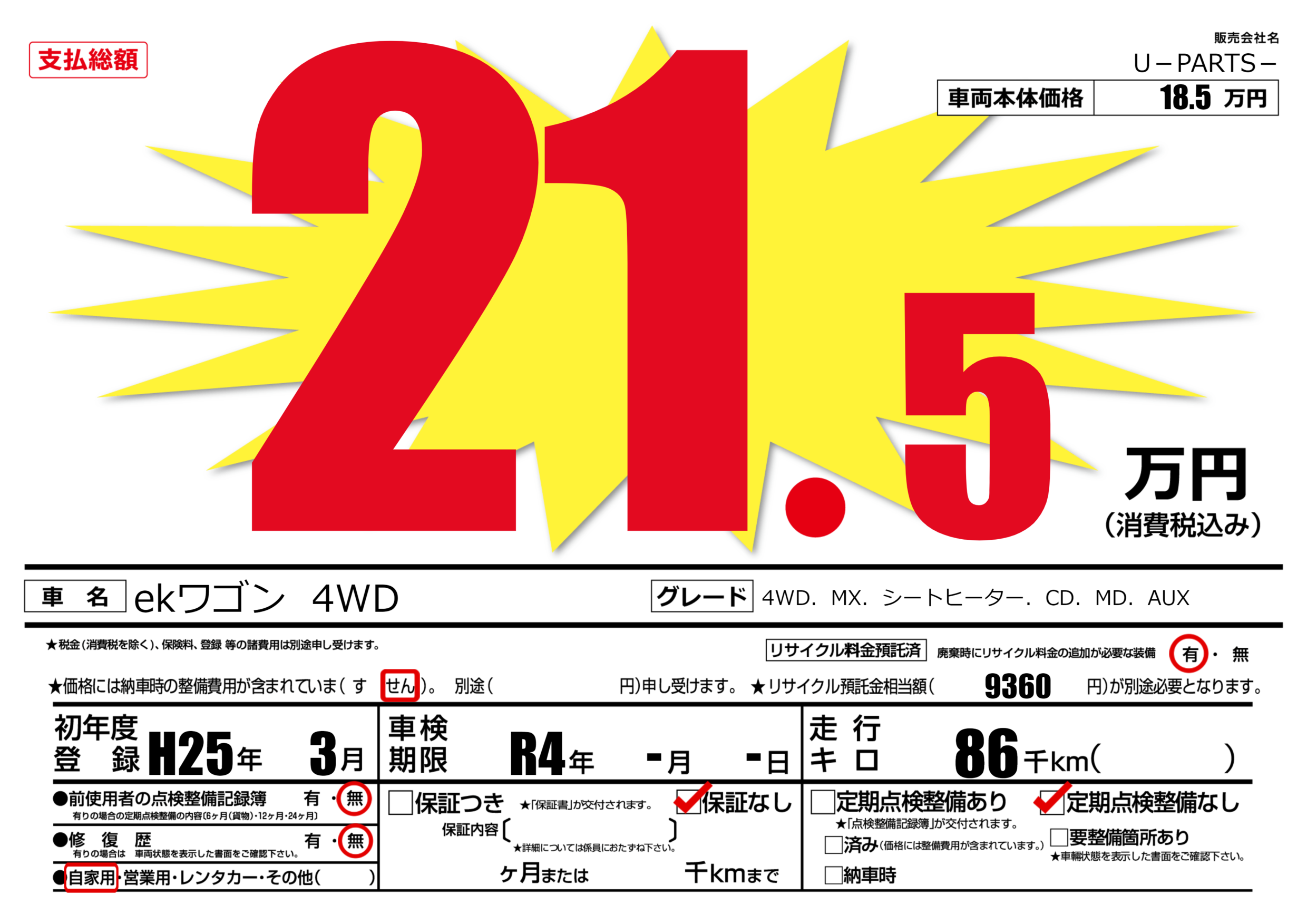 | 車名 | ekワゴン 4WD | グレード ミッション 排気量 |