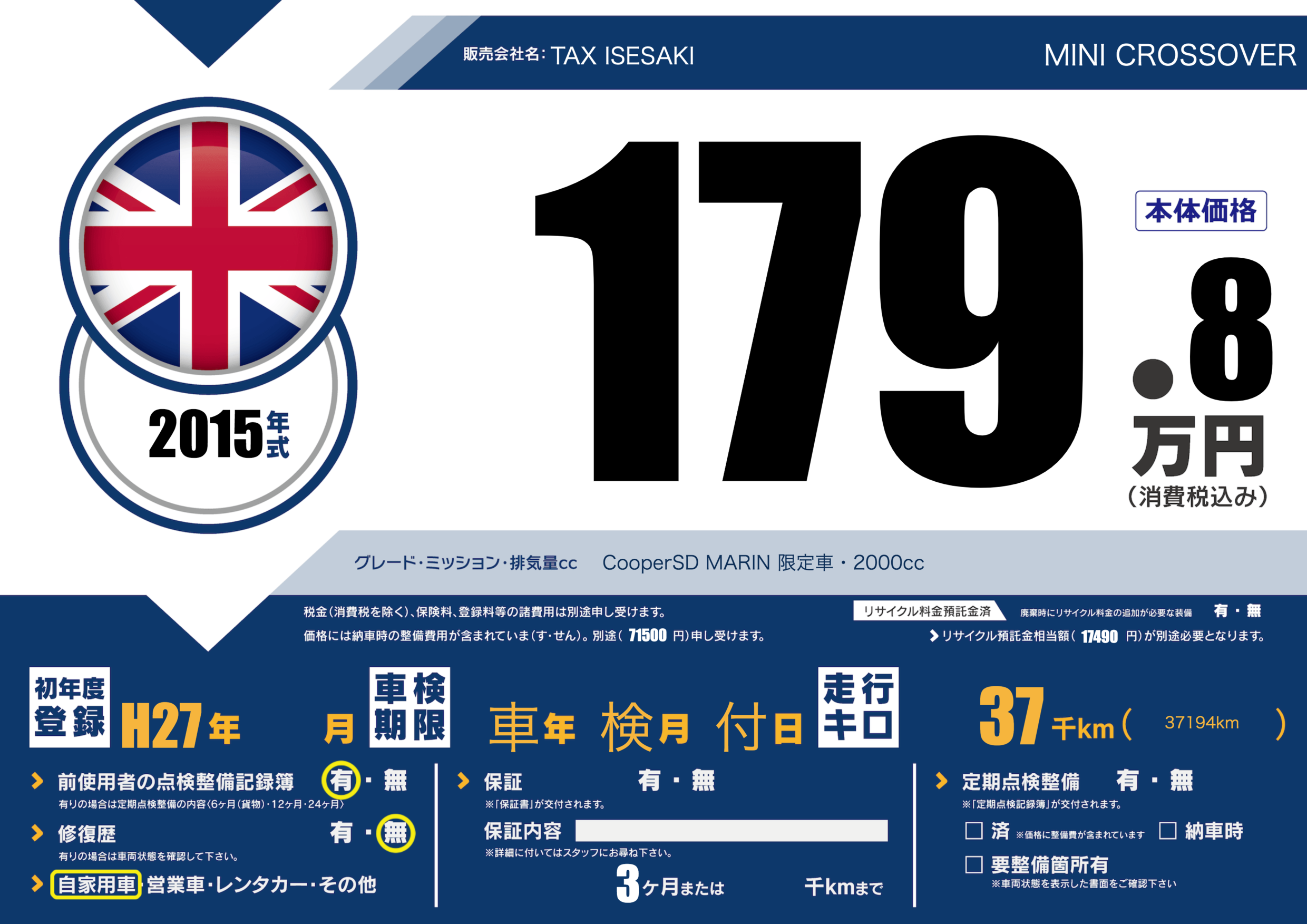 | 車名 | MINI CROSSOVER | グレード ミッション 排気量 |