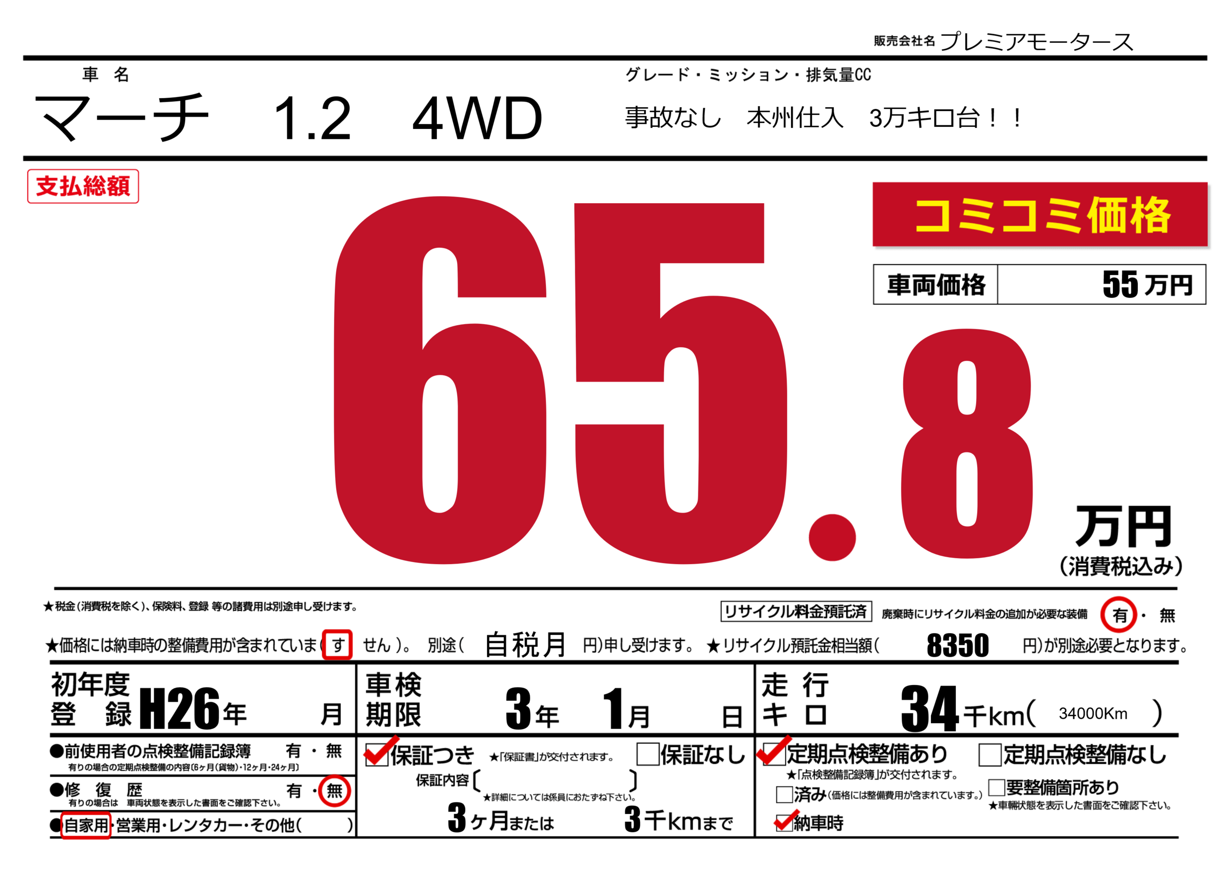 | 車名 | マーチ 1.2 4WD | グレード ミッション 排気量 |