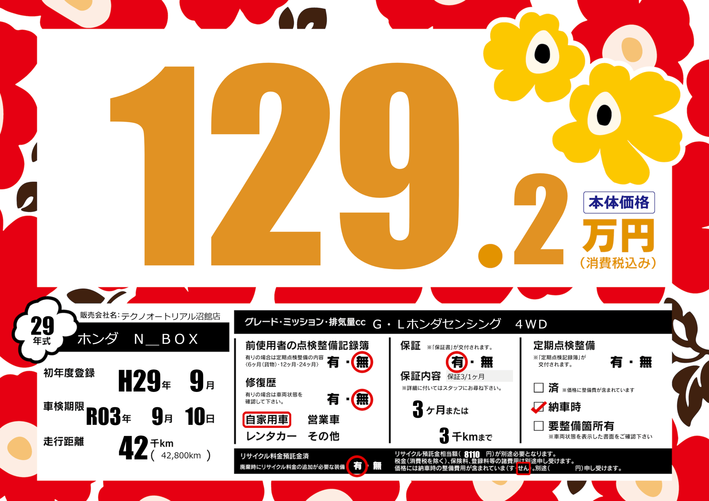 | 車名 | ホンダ N_BOX | グレード ミッション 排気量 |
