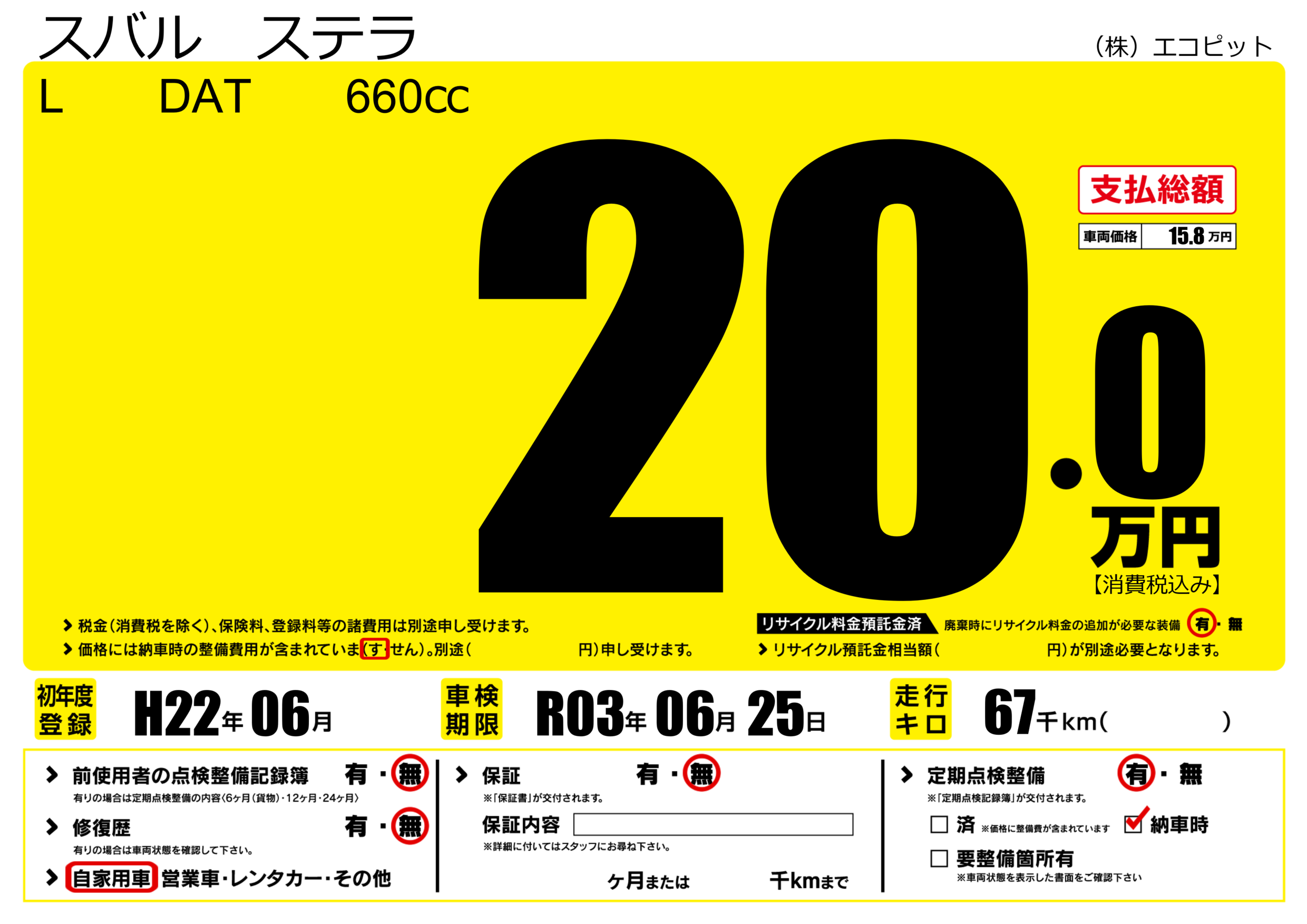 | 走行キロ | 6.7万km | 初年度登録 | H22年06月 |