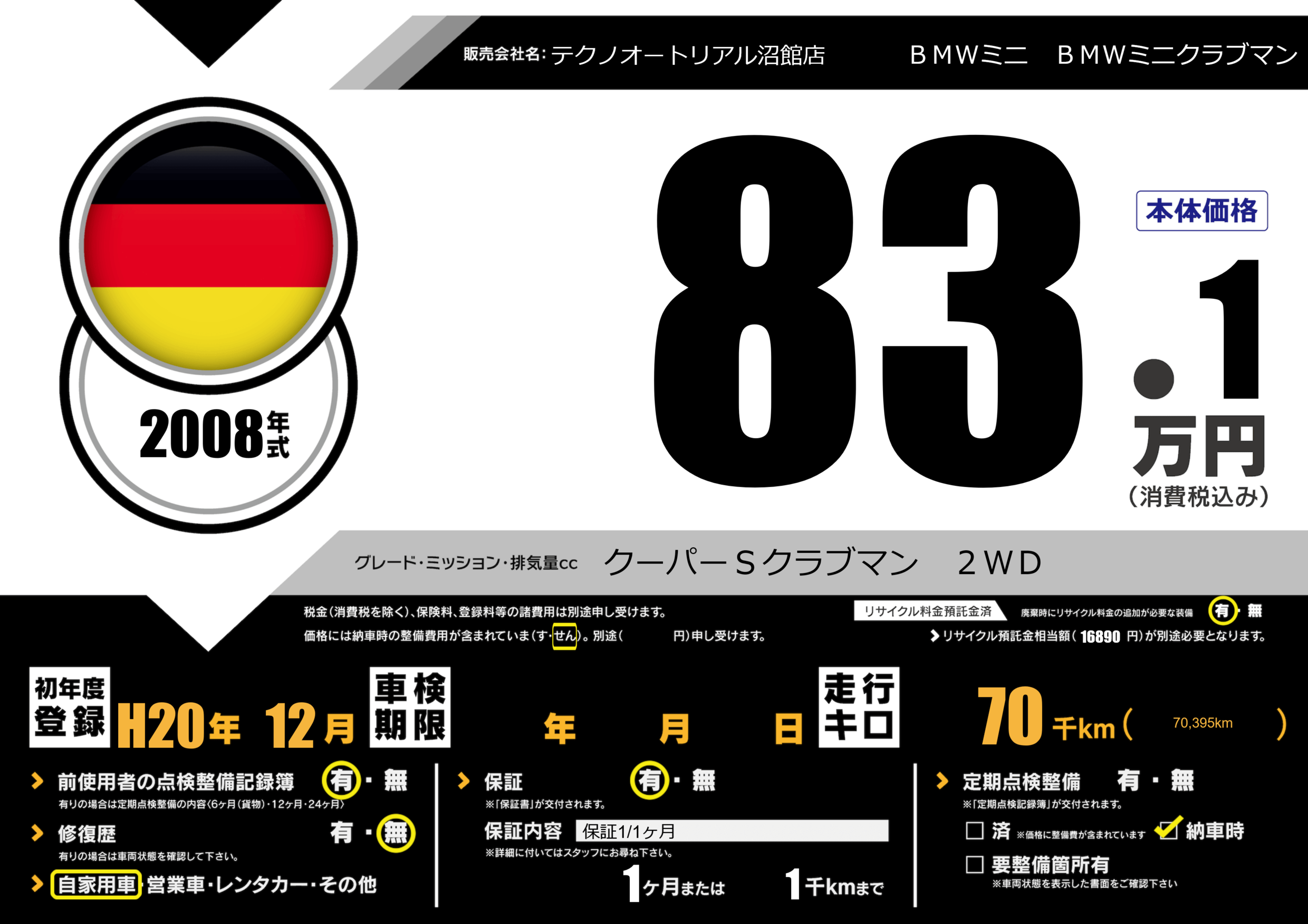 | 車名 | BMWミニ BMWミニクラブマン | グレード ミッション 排気量 |