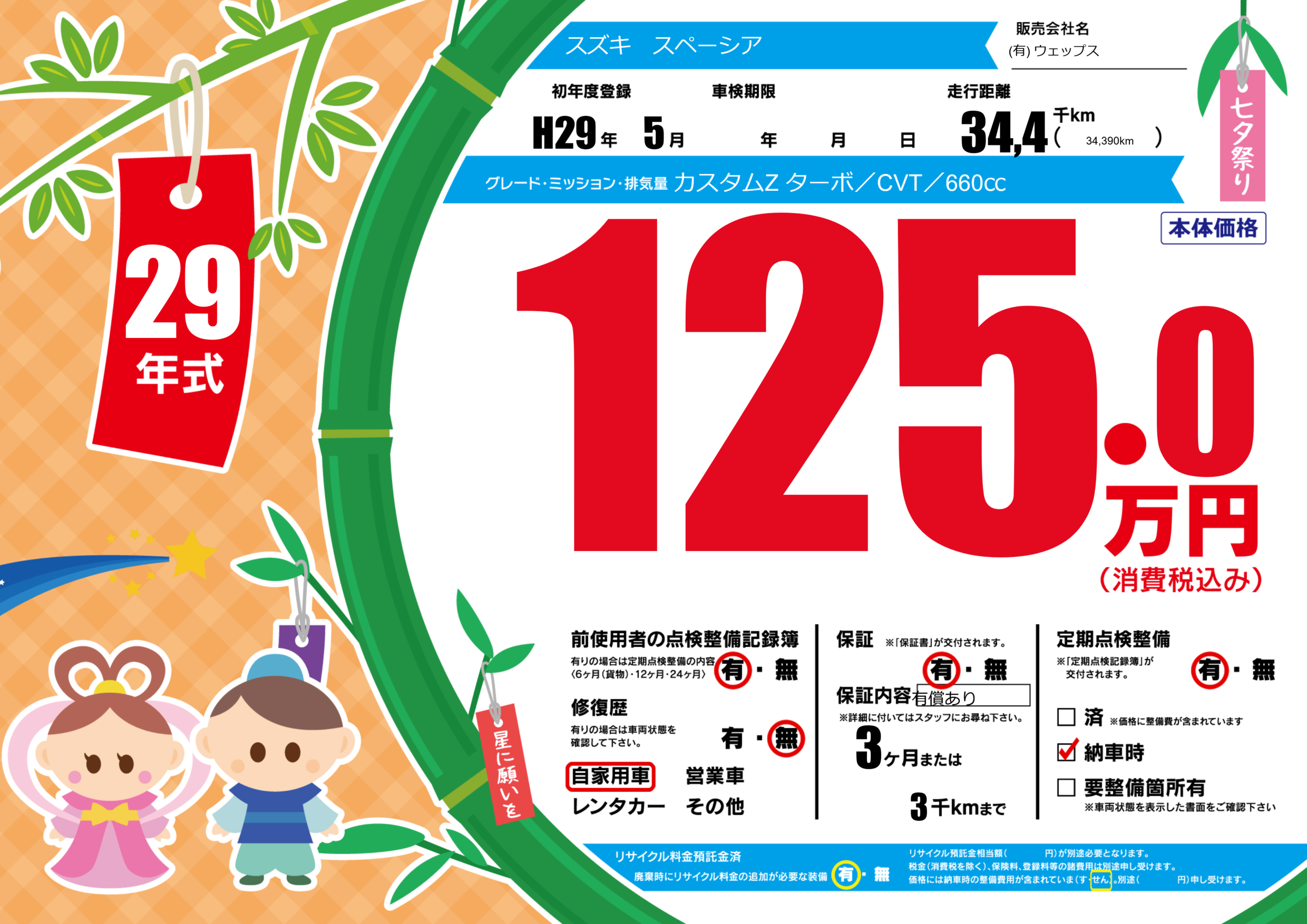 | 車名 | スズキ スペーシア | グレード ミッション 排気量 |
