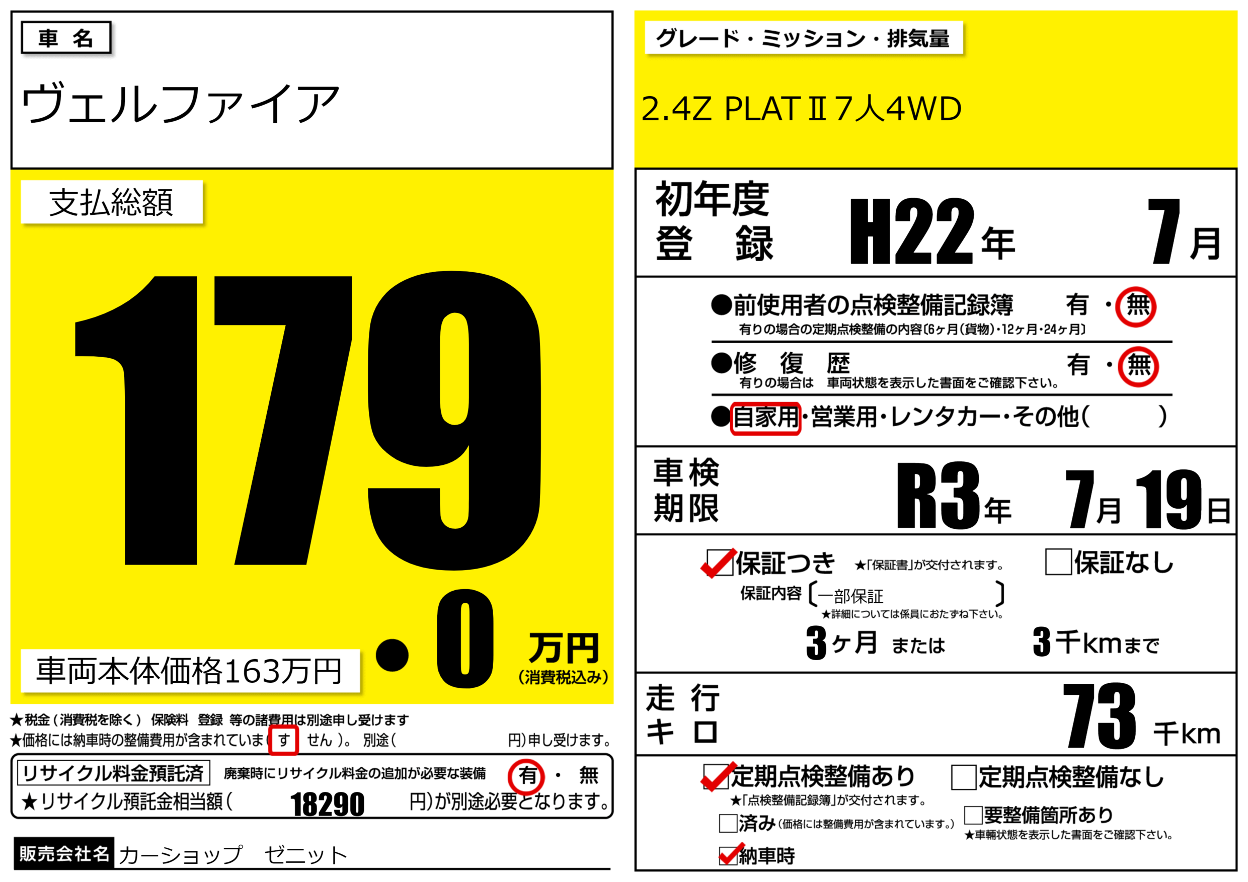 | 定期点検整備 | 定期点検整備あり 納車時あり | ||