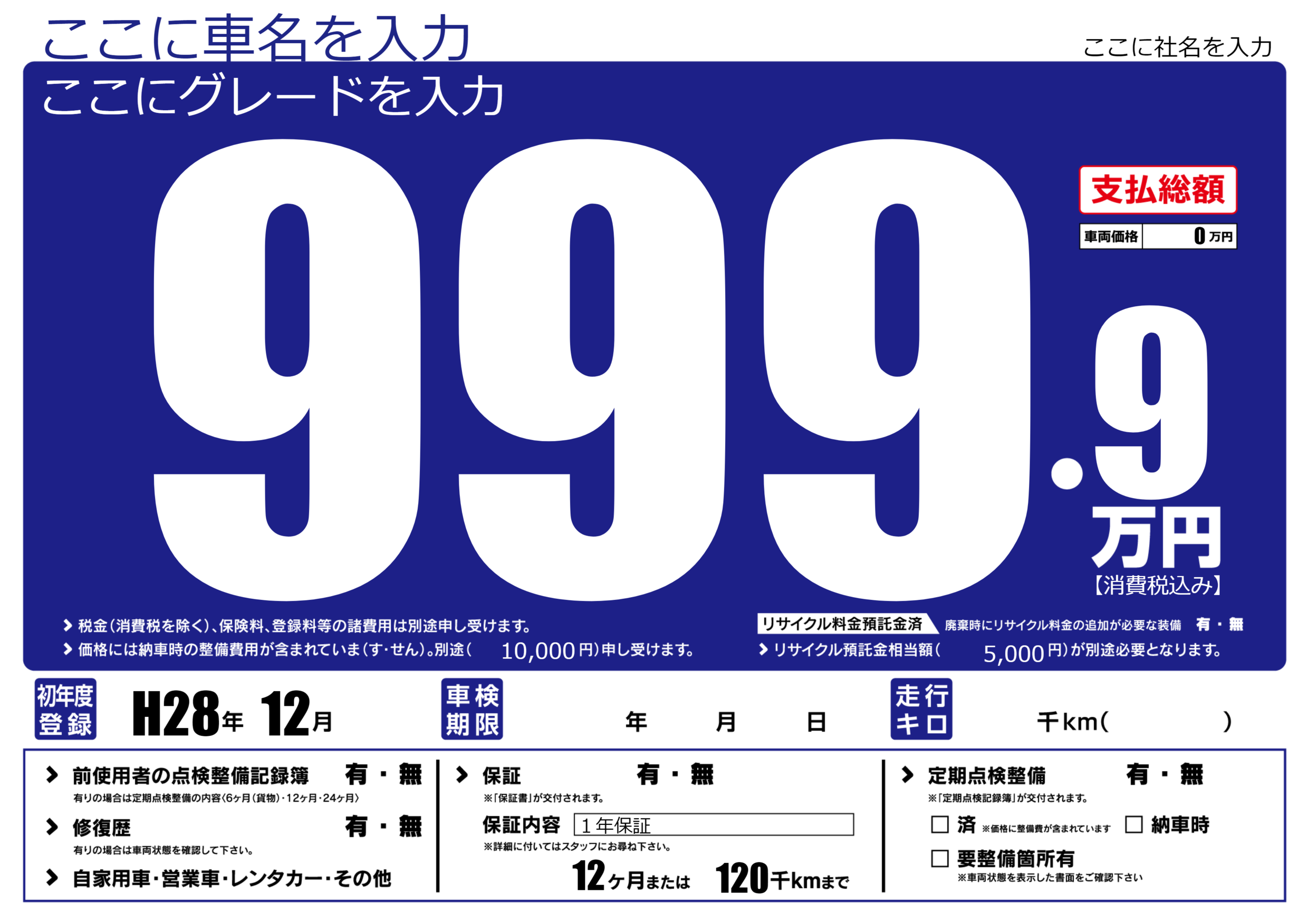 | 車名 | ここに車名を入力 | グレード ミッション 排気量 |
