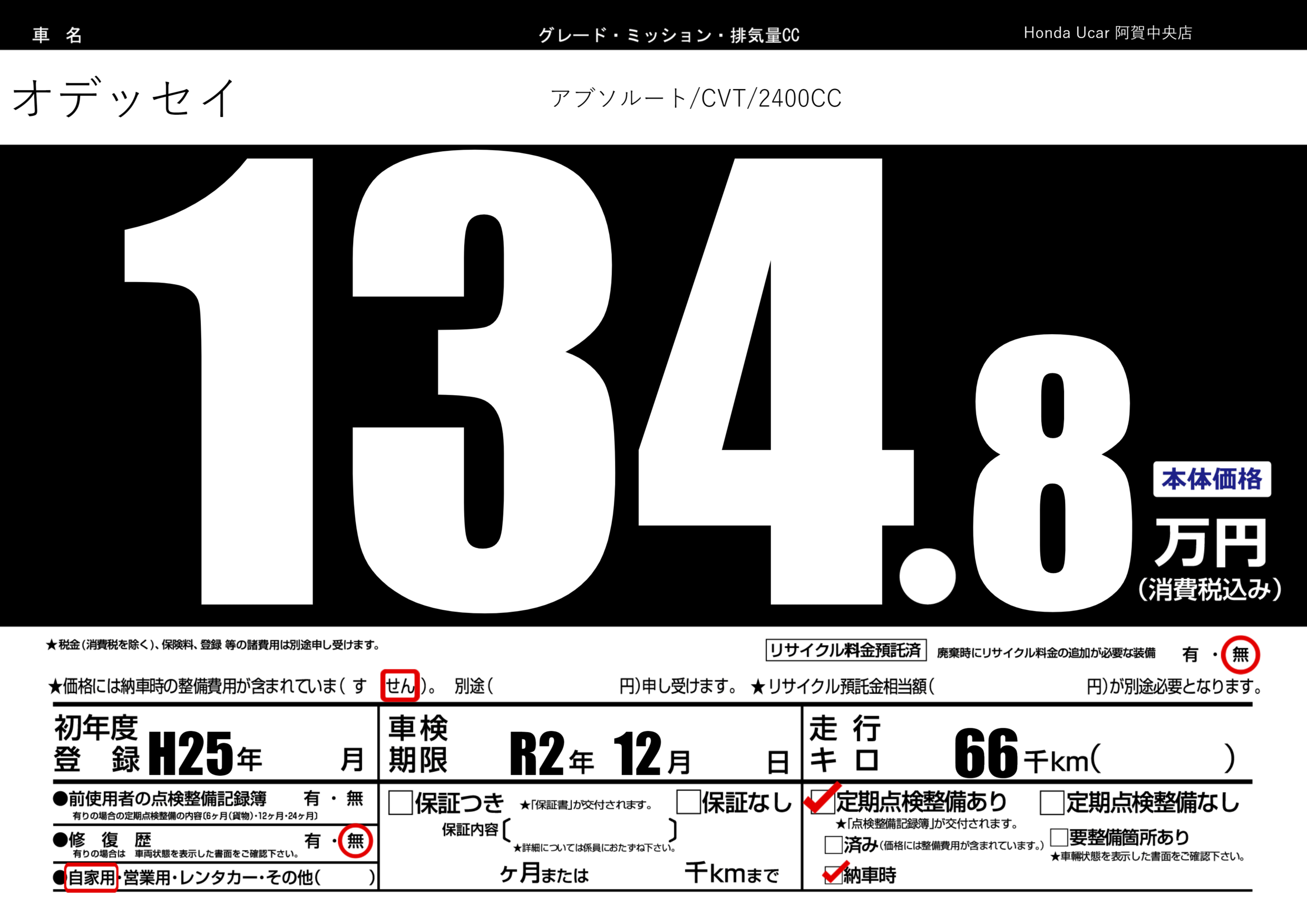 | 車名 | オデッセイ | グレード ミッション 排気量 |