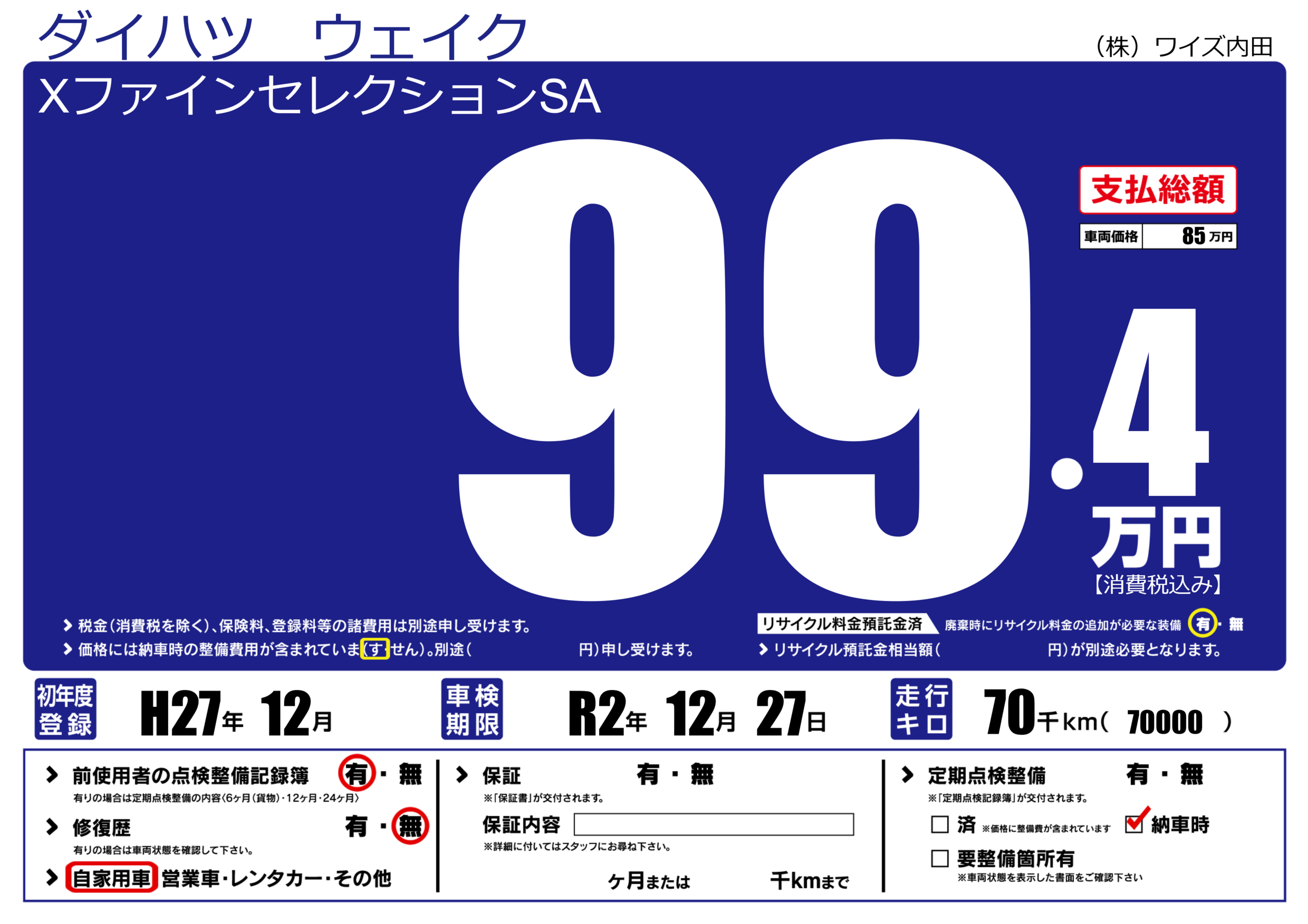 | 車名 | ダイハツ ウェイク | グレード ミッション 排気量 |