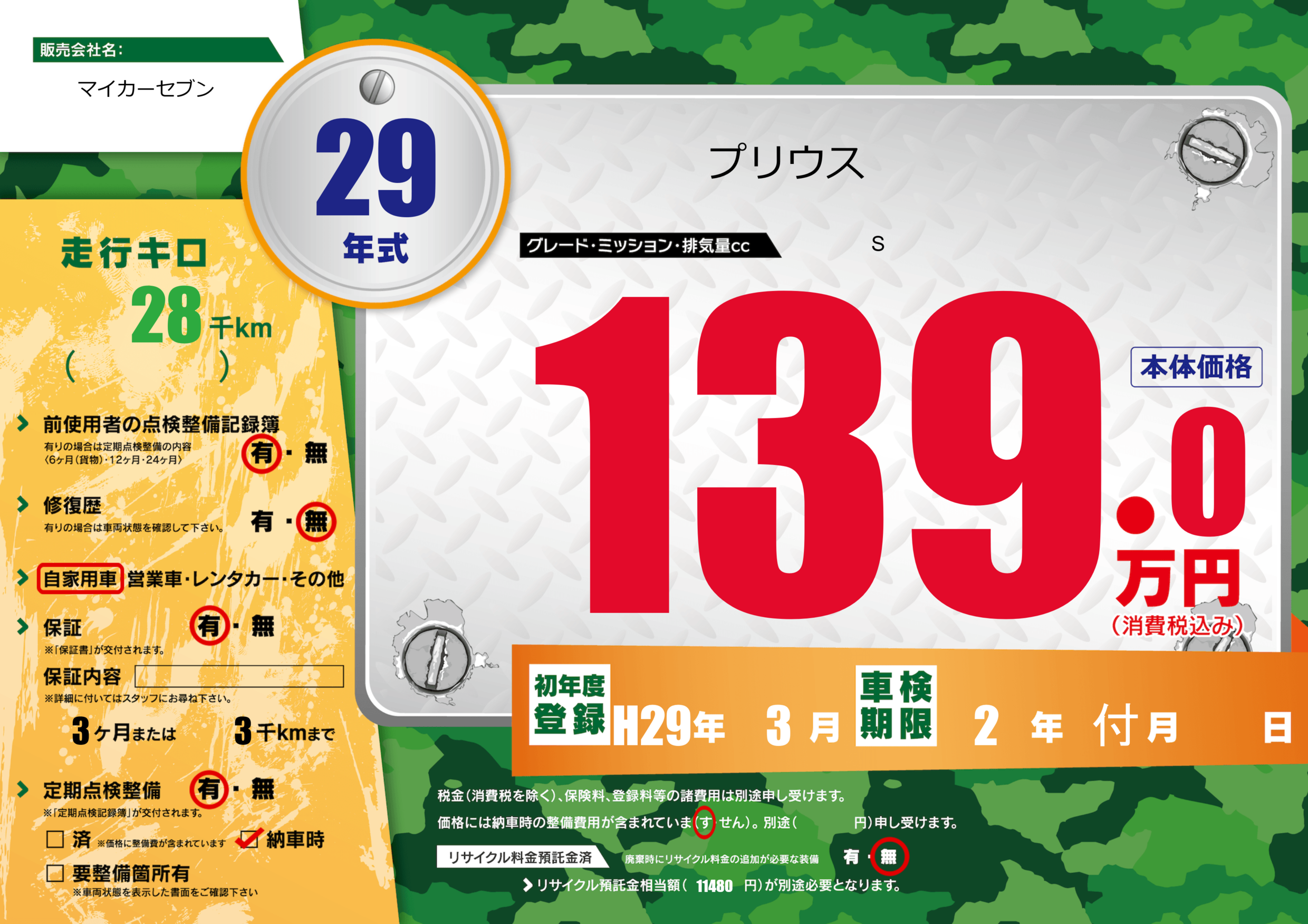 保証付き 保証内容(---) 3ヶ月または(3)千kmまで |