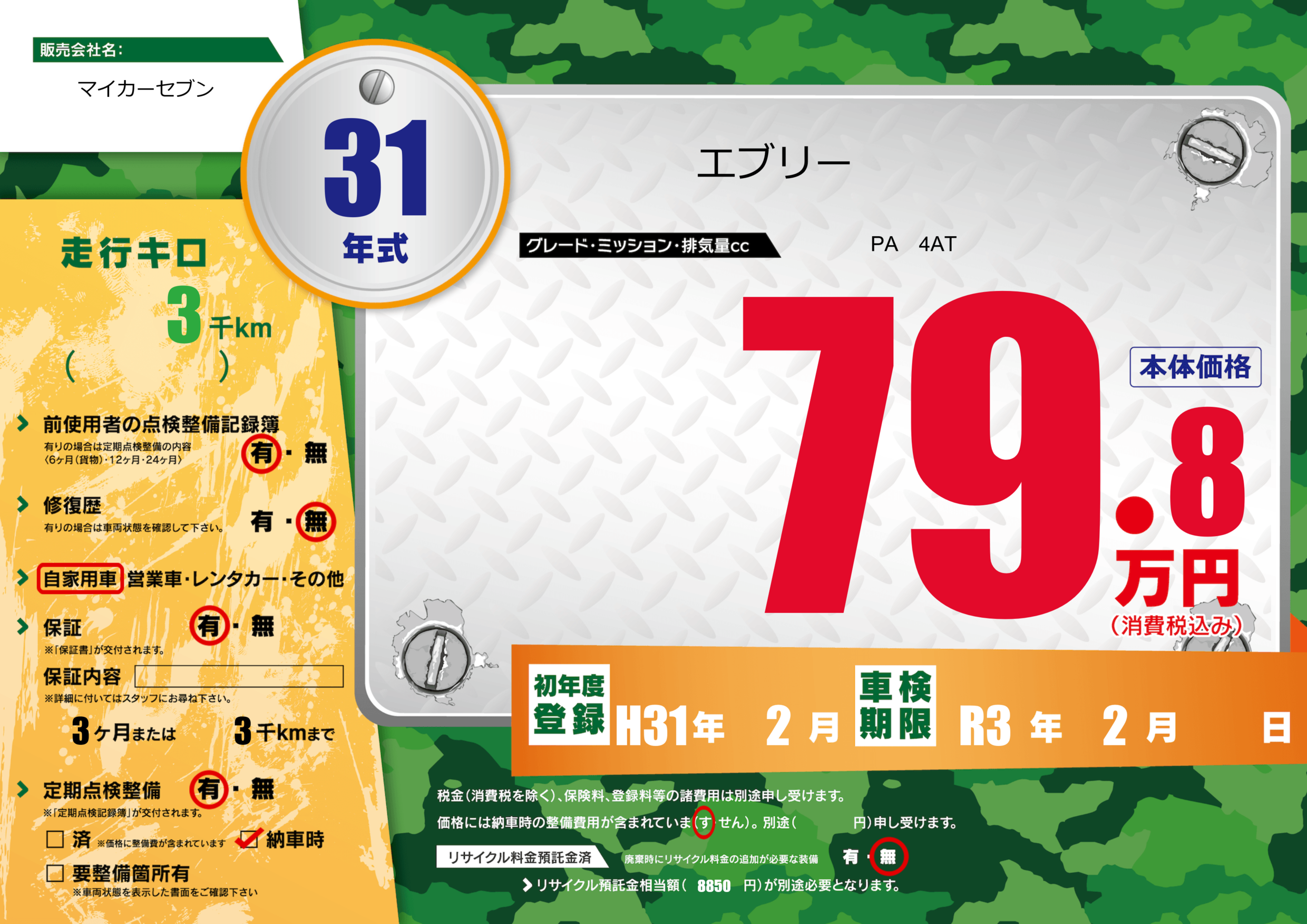 | 車名 | エブリー | グレード ミッション 排気量 |