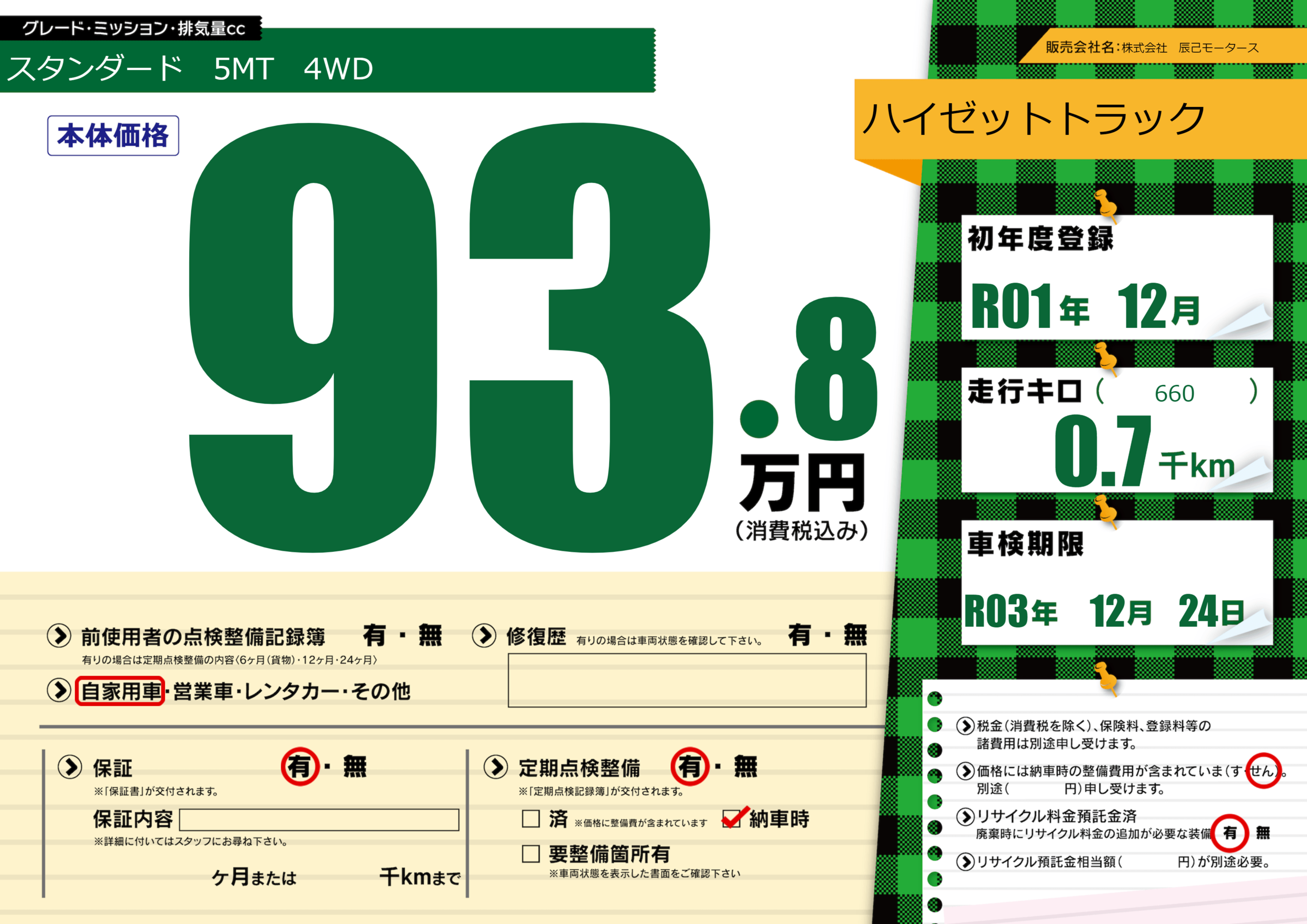 | 定期点検整備 | 定期点検整備あり 納車時あり | ||
