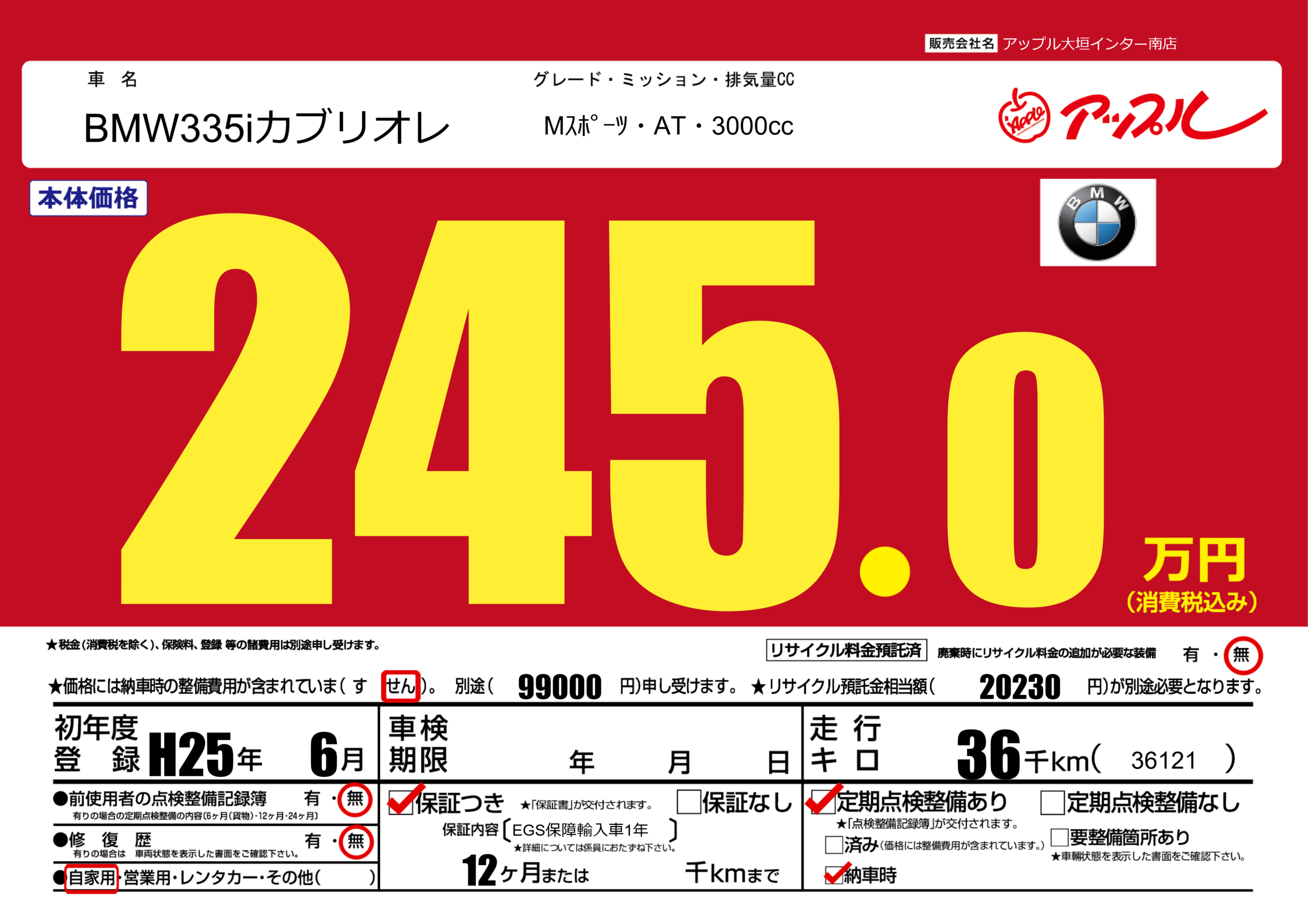 | 車名 | BMW335iカブリオレ | グレード ミッション 排気量 |
