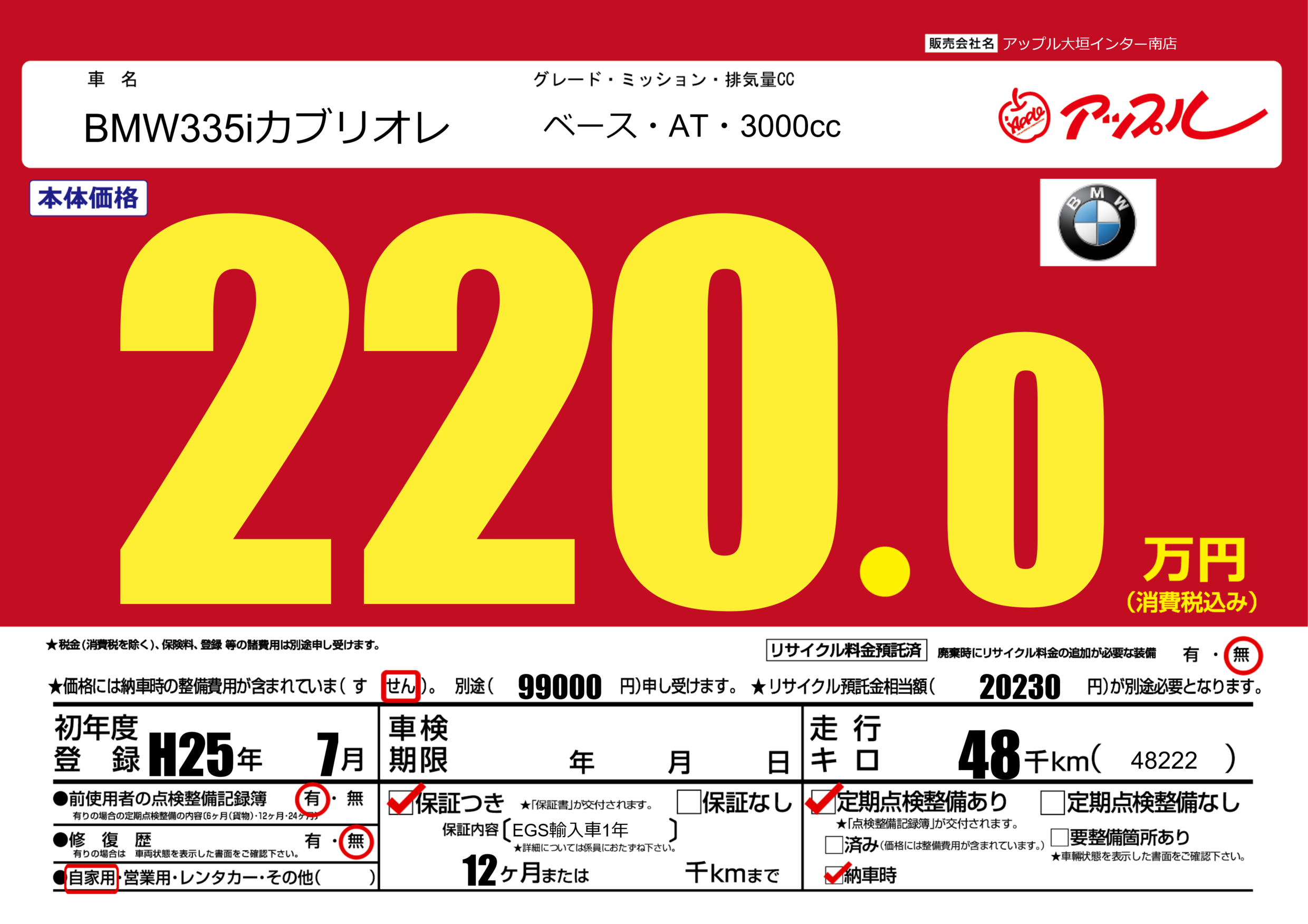 | 車名 | BMW335iカブリオレ | グレード ミッション 排気量 |