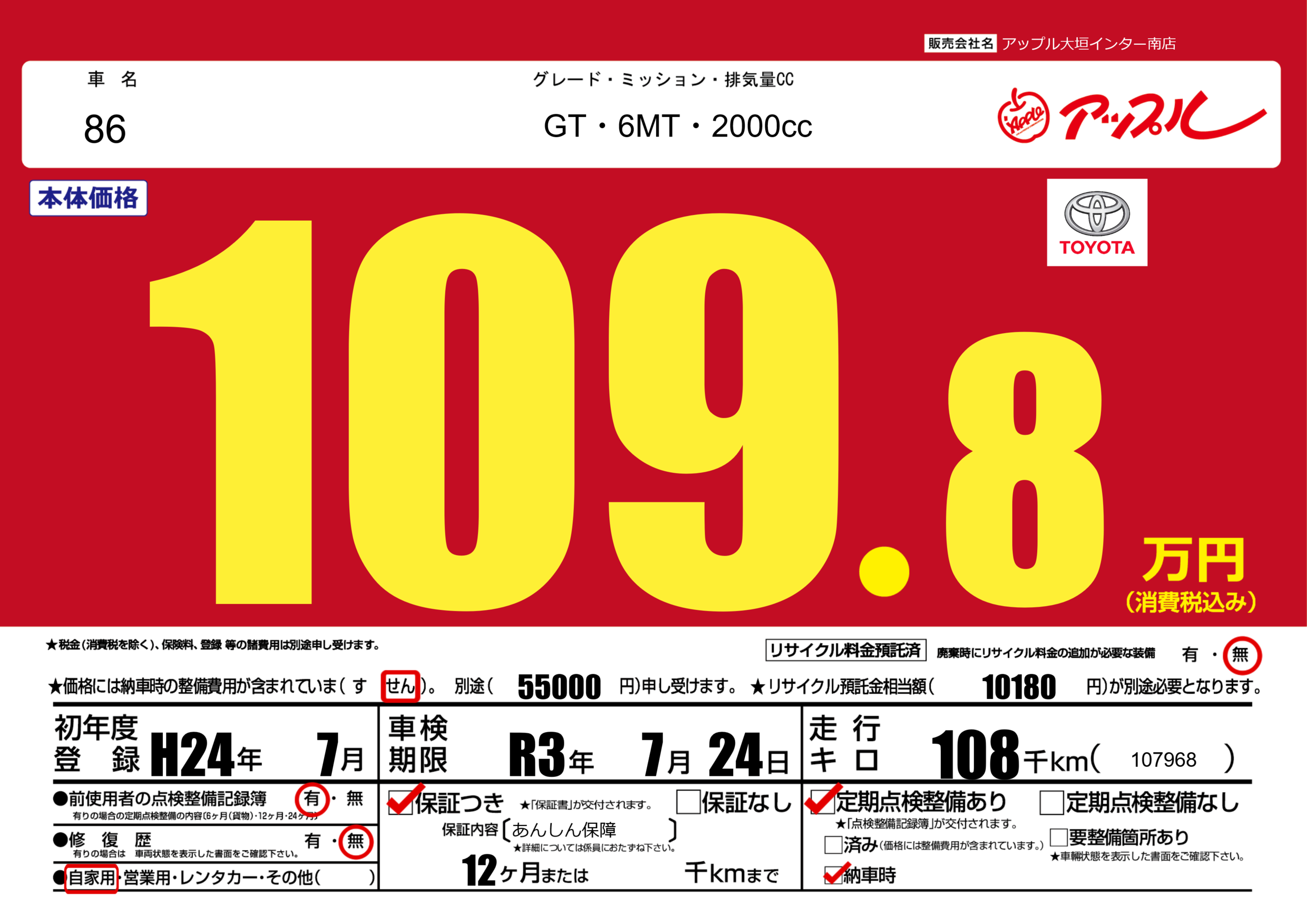 | 定期点検整備 | 定期点検整備あり 納車時あり | ||