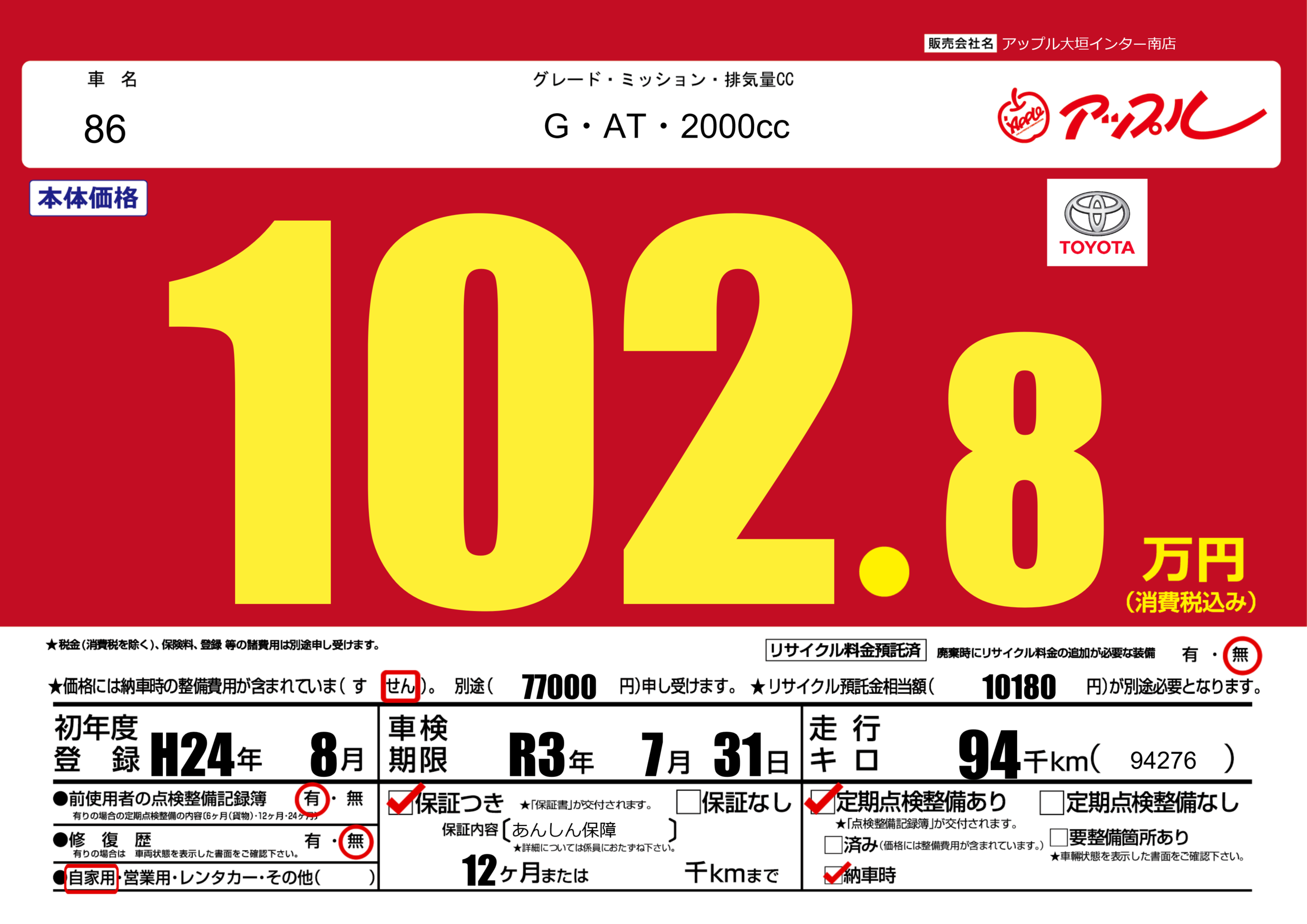 | 定期点検整備 | 定期点検整備あり 納車時あり | ||