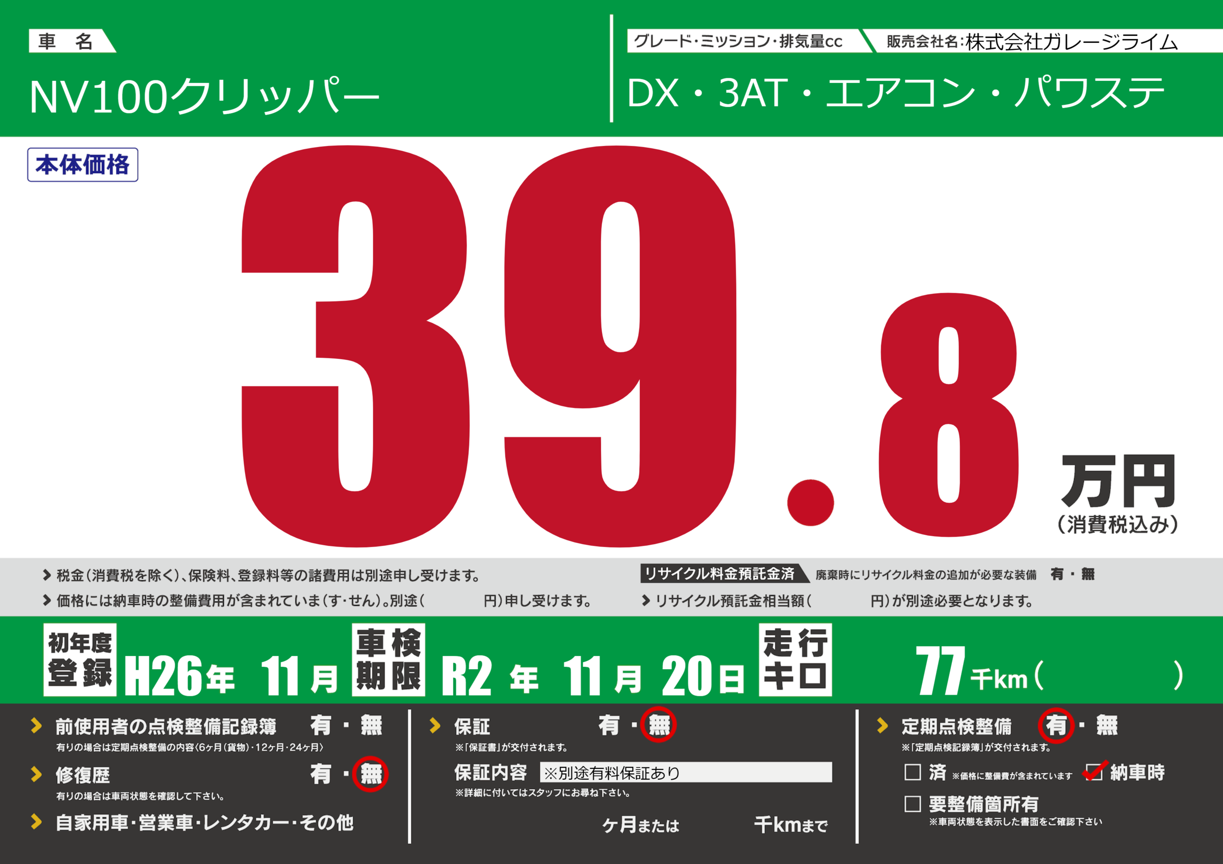 保証なし 保証内容(※別途有料保証あり) ---ヶ月または()千kmまで |