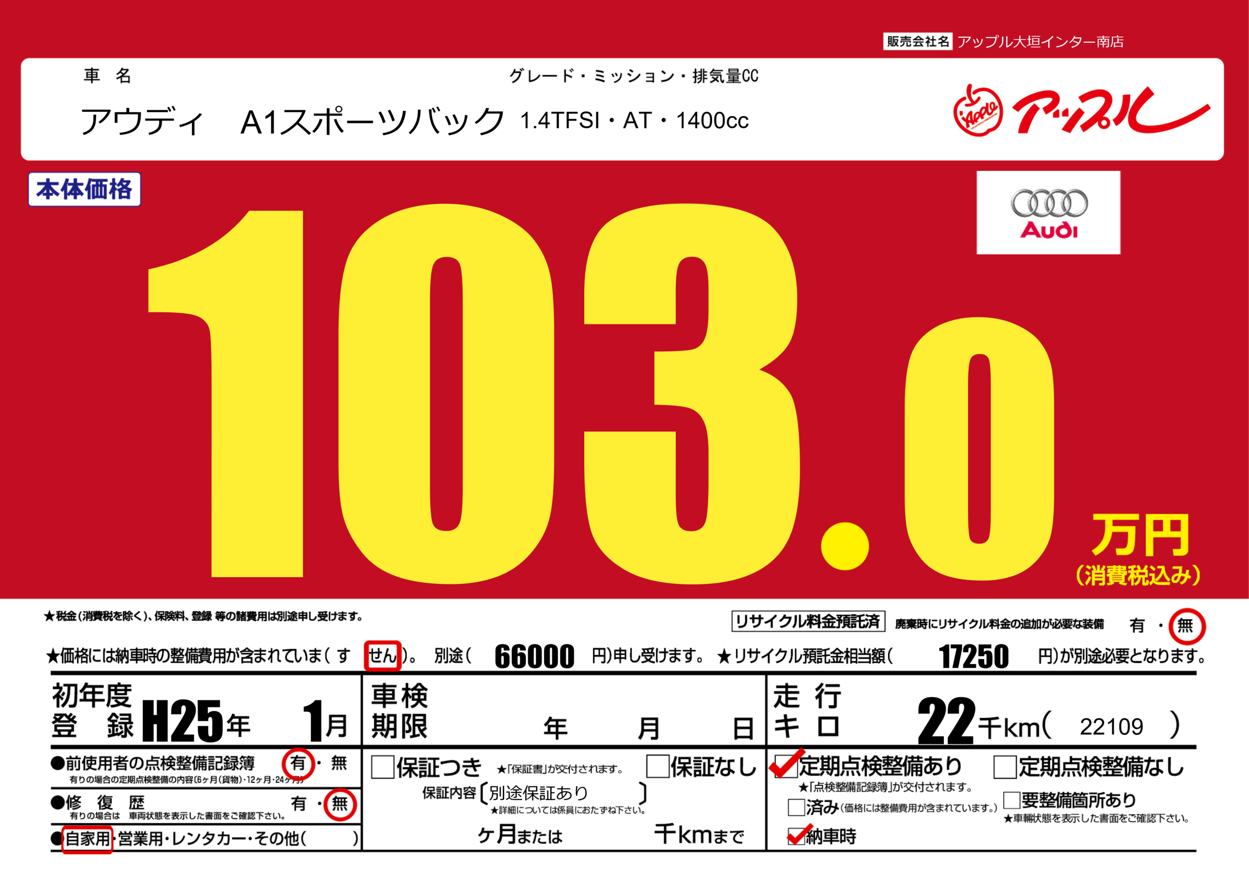 | 車名 | アウディ A1スポーツバック | グレード ミッション 排気量 |