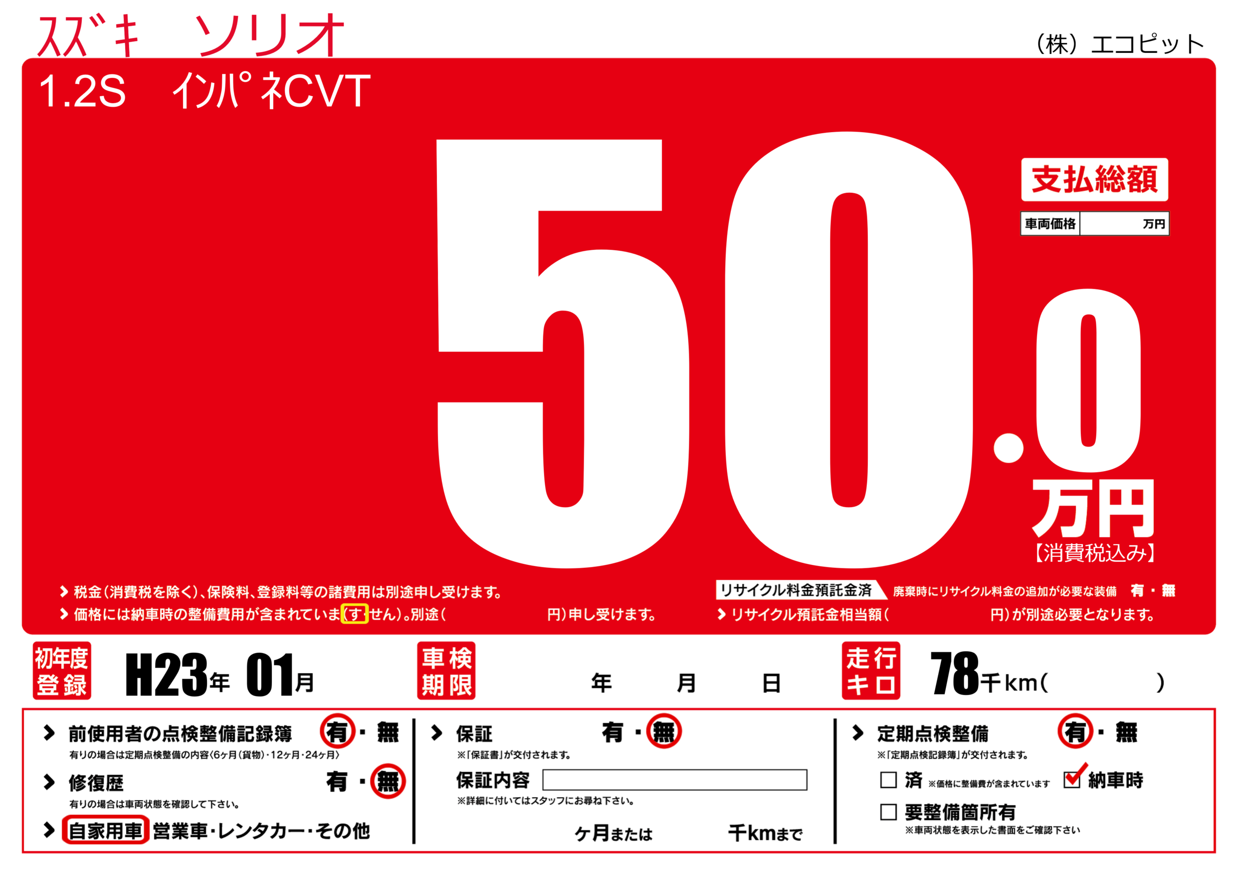 | 走行キロ | 7.8万km | 初年度登録 | H23年01月 |