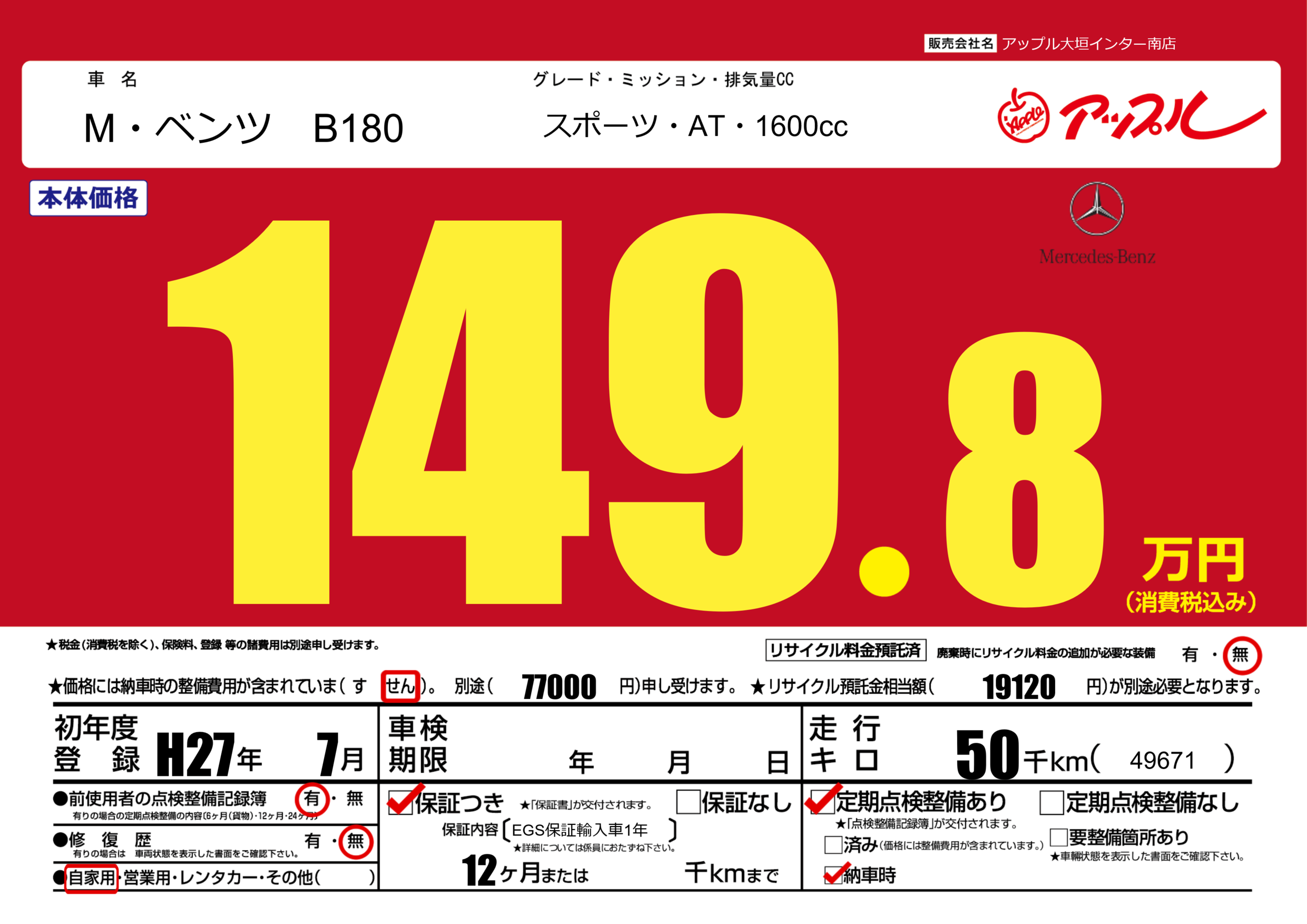 | 車名 | M・ベンツ B180 | グレード ミッション 排気量 |