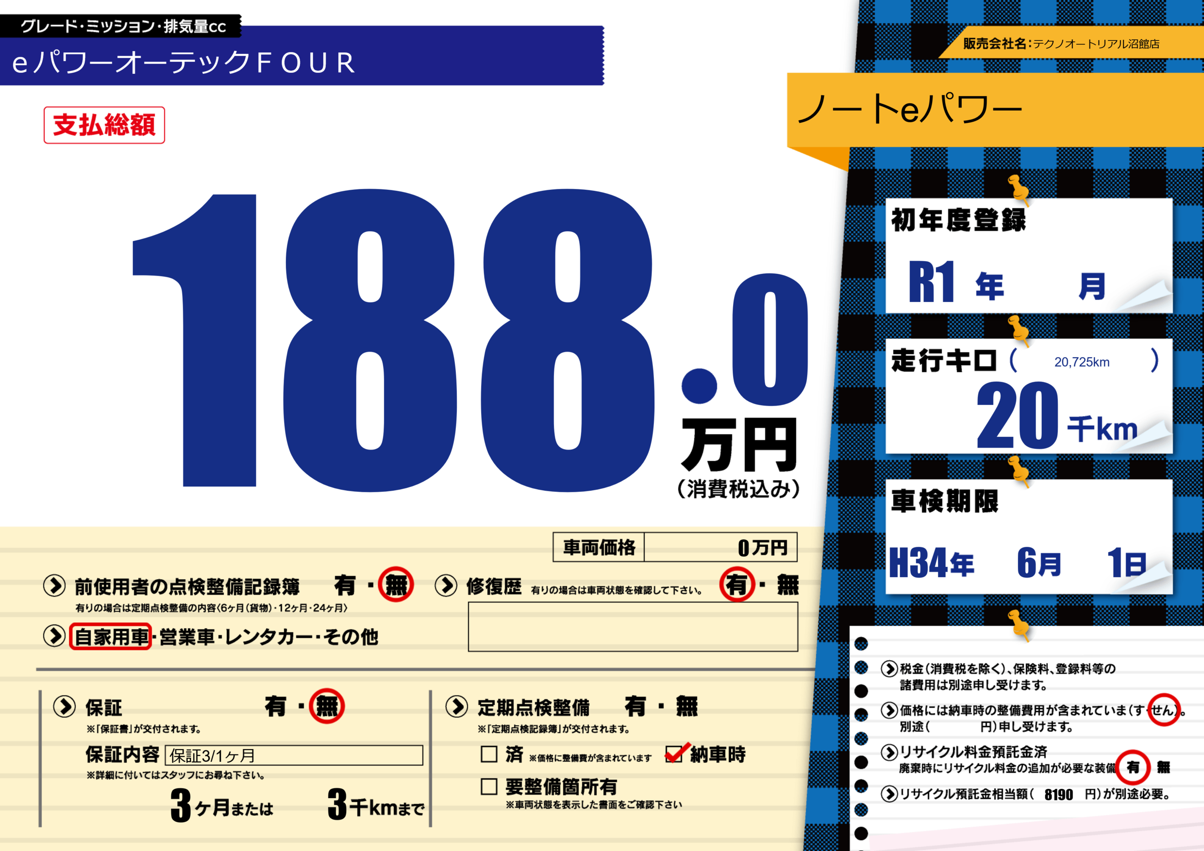 | 車名 | ノートeパワー | グレード ミッション 排気量 |